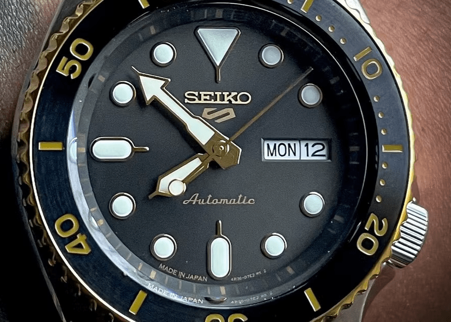 - Movement: Seiko 4R36 automatic movement with manual winding capability