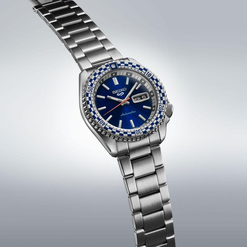 As a re-creation of the 1969 piece, this model maintains the looks and petrol blue colour scheme. It features the same dial, 60s-style hands, and checkered bezel as the original. It also pays homage to the fan-favourite Seiko 5 Sports SKX case design.