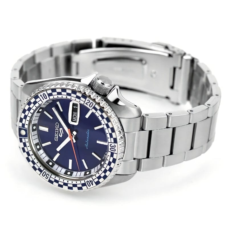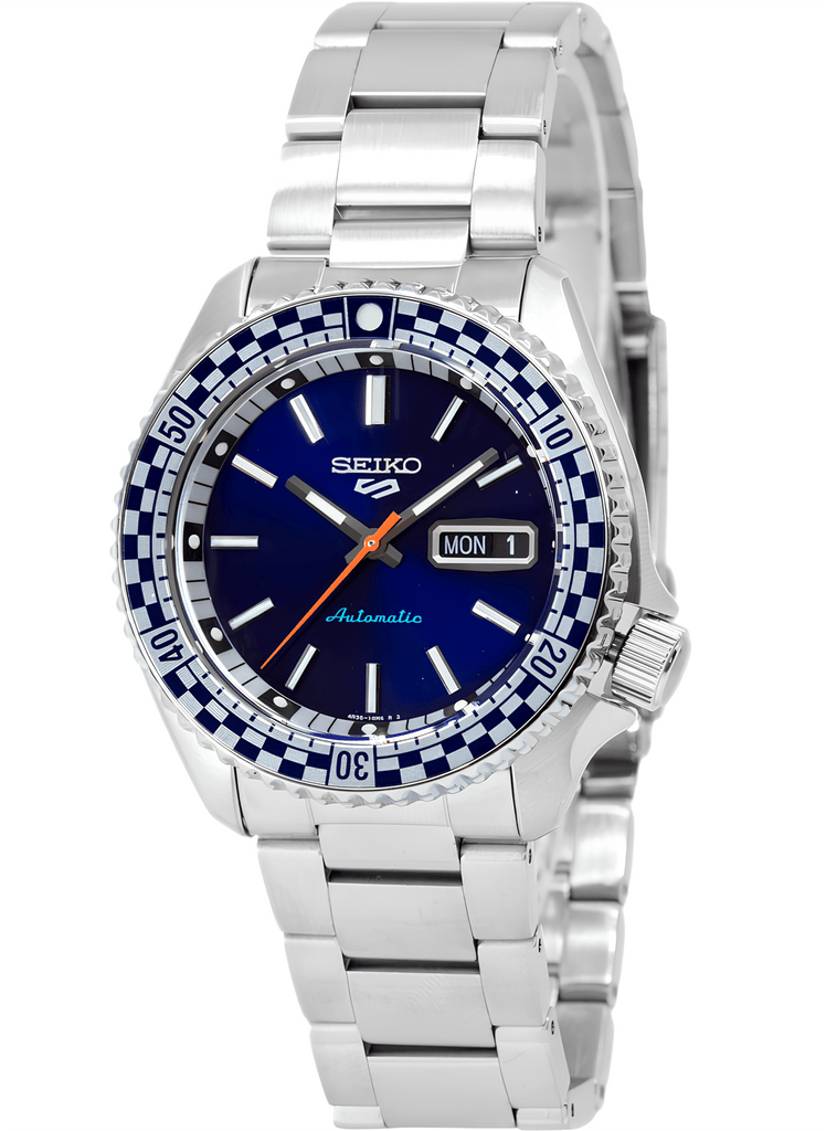 Seiko 5 Sports Petrol Blue Checker Flag Special Edition Blue Dial Silver Steel Strap Watch For Men - SRPK65K1