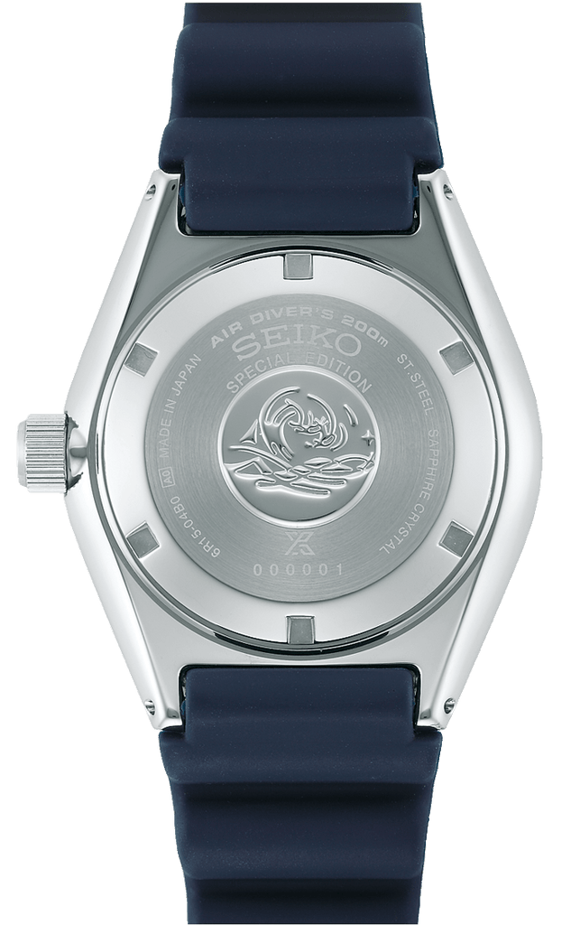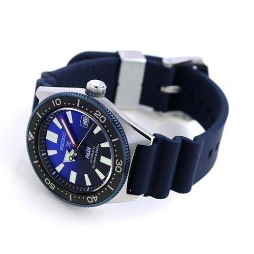 Seiko prospex PADI mens watch SPB071J1. Curved sapphire crystal. Stainless steel case with a blue silicon strap, blue dial. Case thickness: 13.8, case diameter: 42.6. Water resistance upto 200m / 660ft diver's. Anti-reflective coating on crystal inner surface. Movement Caliber Number 6R15. Automatic movement with manual winding. Accuracy +25 to -15 seconds per day. Lumibrite on hands and indexs. Features: 23 jewels, date display, stop second hand function.