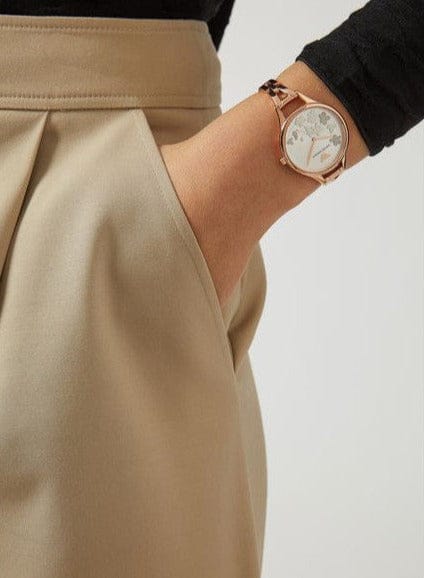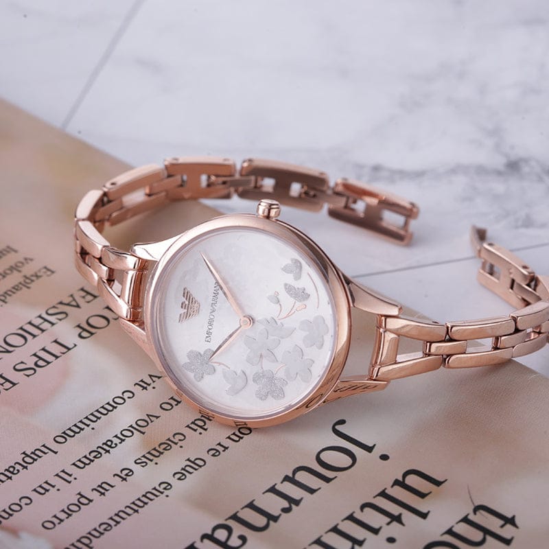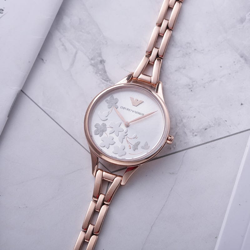 The round silver dial is adorned with a stunning floral pattern and the iconic Emporio Armani logo. Complete with a delicate bracelet and secure fold-over clasp. Bracelet Watch With Shiny Finish And Folding Clasp. The Distance Of The Bends Is 10 Mm.