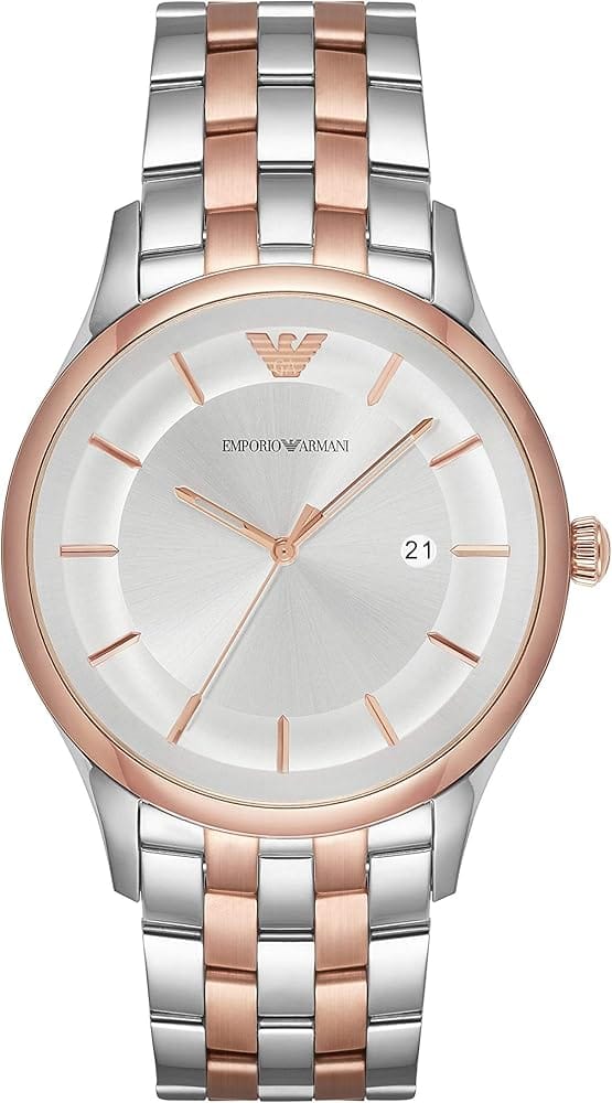 A timepiece for everyday wear, this beauty by Emporio Armani is made to tell the time in the most efficient way. The watch is made of two-tone stainless steel and it has a silver dial set with gold-tone hour markers, three hands, and a date window.