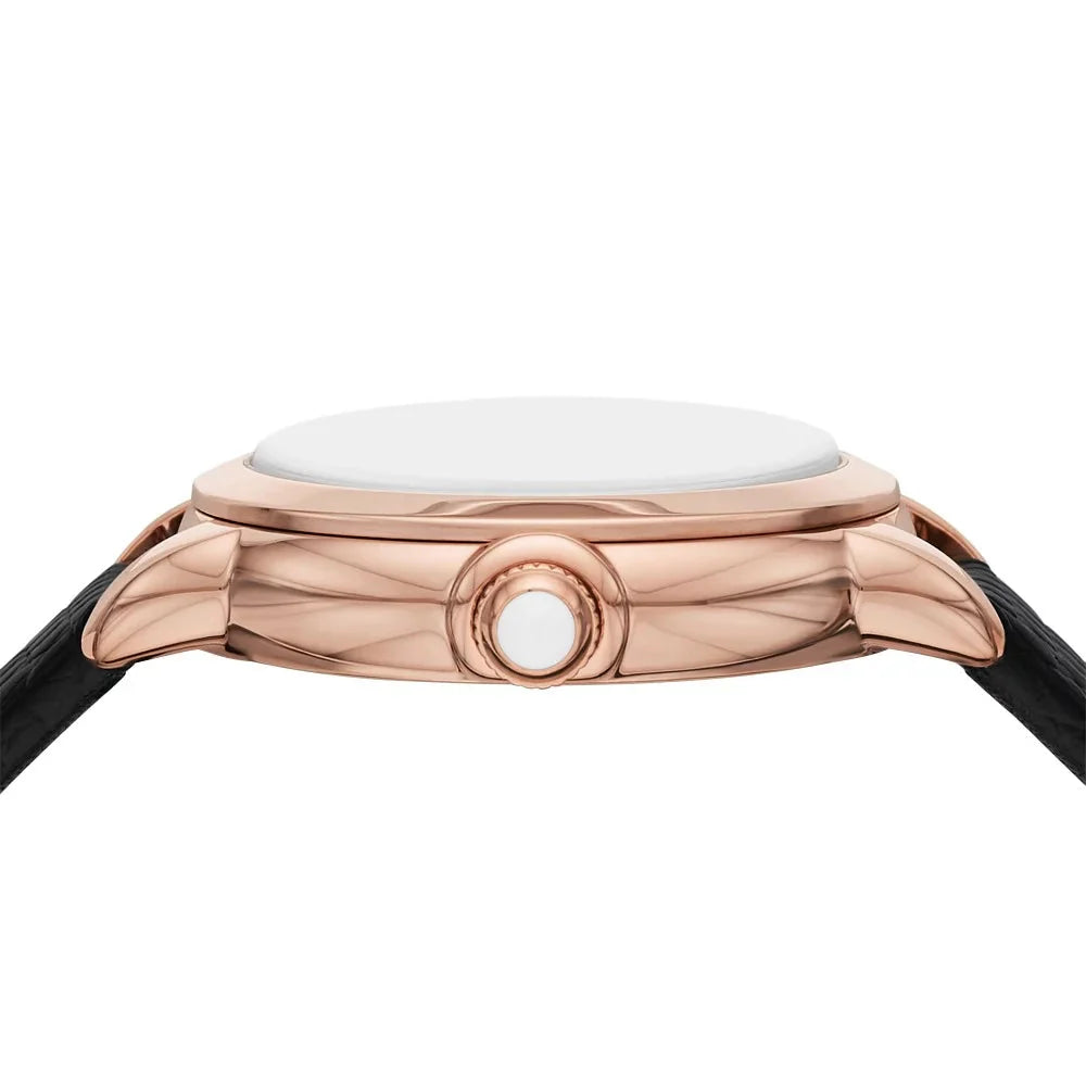 Emporio Armani's 32mm watch features a silver glossy sunray dial, three-hand movement and black lizard patterned leather strap. Amaze everyone around you by wearing this women's analog watch from the collection by Emporio Armani. The silver round dial is protected by a mineral glass. It features a crown for time adjustment.