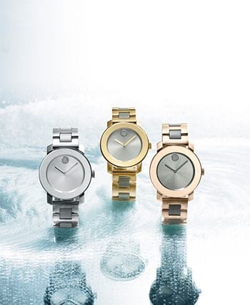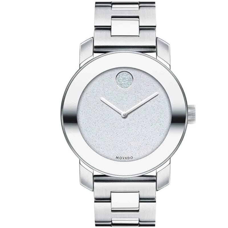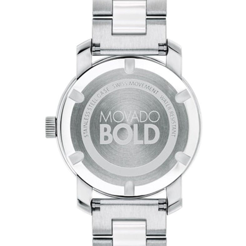 Stainless steel case with a stainless steel bracelet with white ceramic inserts. Fixed stainless steel bezel. Silver metallic dial with silver-tone hands. A crystal-set Movado dot appears at the 12 o'clock position. Dial Type: Analog. Quartz movement. Scratch resistant K1 mineral crystal. Pull / push crown. Solid case back. Round case shape. Case size: 36 mm. Case thickness: 10 mm. Band width: 14 mm. Fold over clasp with a push button release. Water resistant at 30 meters / 100 feet. Functions: hour, minute. Dress watch style. Watch label: Swiss Made. Movado Bold Ceramic Quartz Ladies Watch 3600638.