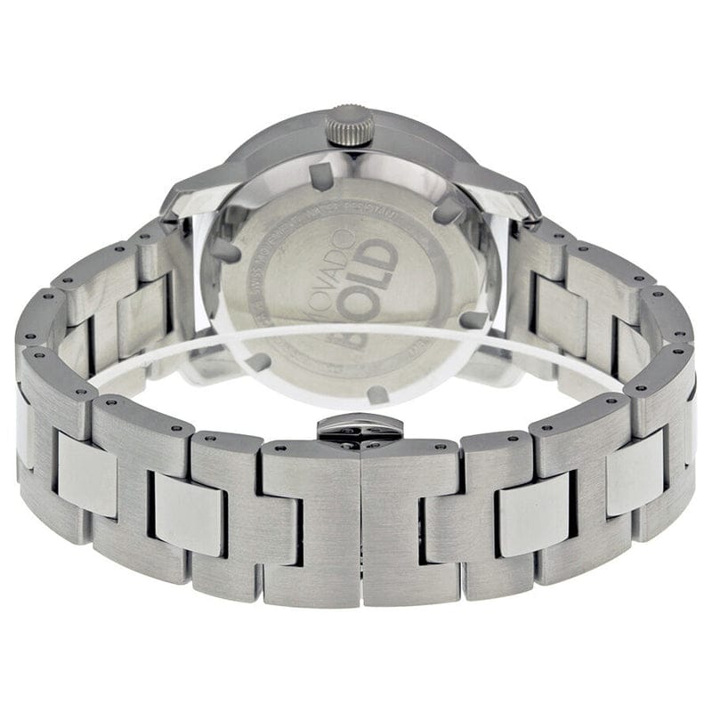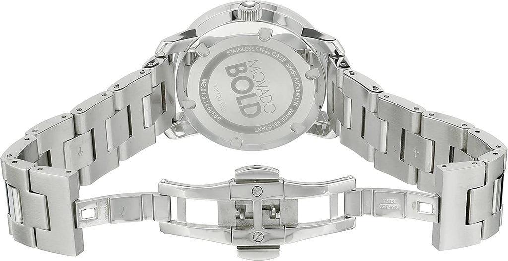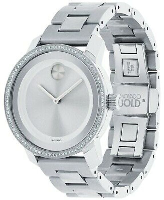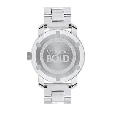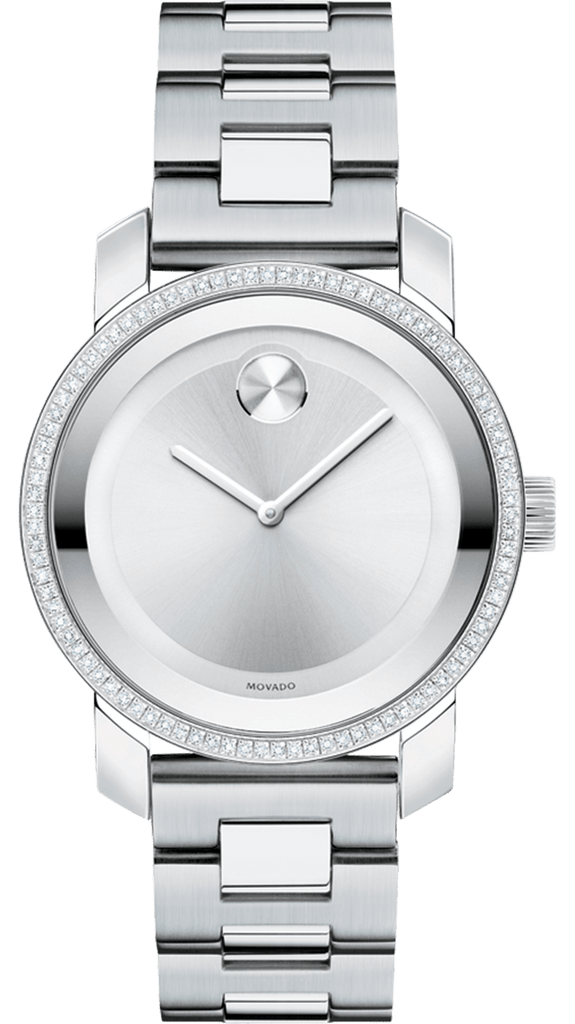 The Movado Bold series expresses a modern attitude. With a new graphic 3D dot at 12 o'clock (Movado's signature) an elegant metallic sheen and streamlined silhouette, this 36mm stainless steel watch defines understated glamour. This timepiece features 90 brilliant diamonds along its refined bezel, a silver-toned dial and stainless steel link bracelet equipped with a deployment clasp for easy wear. Powered by Swiss quartz movement and water resistant up to 30 meters, this timepiece fuses timeless design and meticulous craftsmanship.