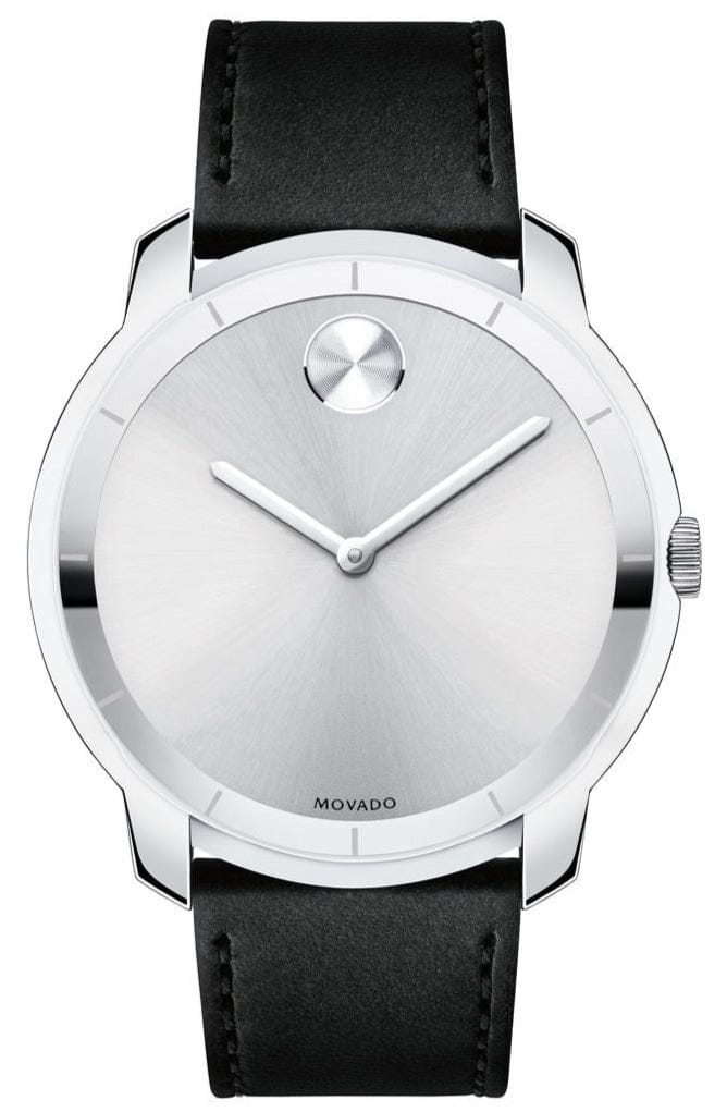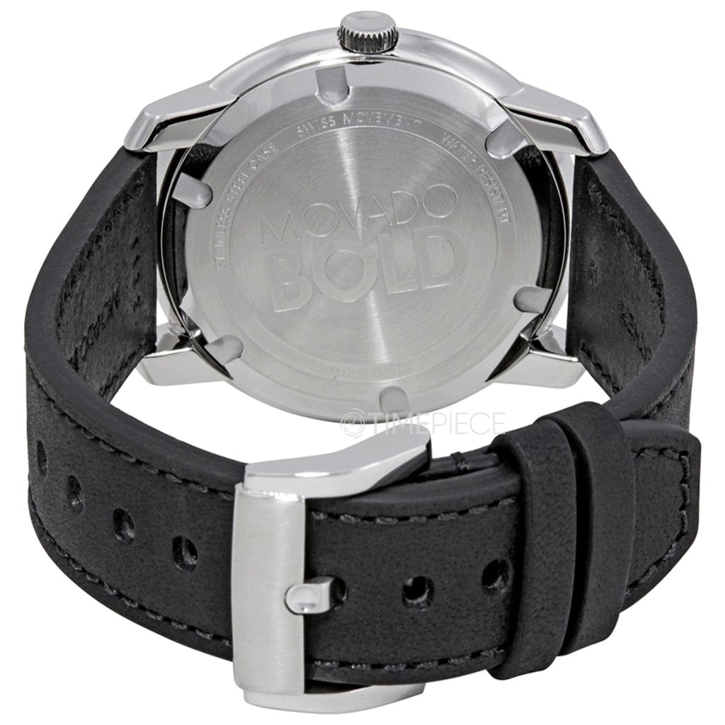 Stainless steel case with a black leather strap. Fixed stainless steel bezel. Silver dial with silver-tone hands and index hour markers. The Movado dot appears at the 12 o'clock position. Dial Type: Analog. Quartz movement. Scratch resistant K1 mineral crystal. Solid case back. Round case shape. Case size: 44 mm. Band width: 20 mm. Tang clasp. Water resistant at 30 meters / 100 feet. Functions: hour, minute. Dress watch style. Movado Bold Silver Dial Men's Black Leather Watch 3600468.
