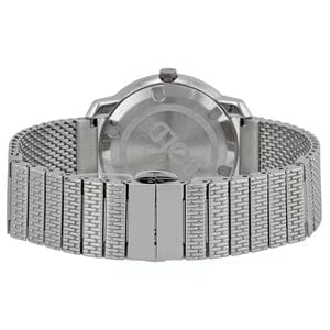 Stainless steel case with a stainless steel mesh bracelet. Fixed stainless steel bezel. Silver dial with silver-tone hands and index hour markers. The Movado dot appears at the 12 o'clock position. Dial Type: Analog. Quartz movement. Scratch resistant K1 crystal. Pull / push crown. Solid case back. Case diameter: 36 mm. Round case shape. Deployment clasp with a push button release. Water resistant at 30 meters / 100 feet. Functions: hour, minute. Casual watch style. Movado Bold Silver Dial Stainless Steel Mesh Ladies Watch 3600241.