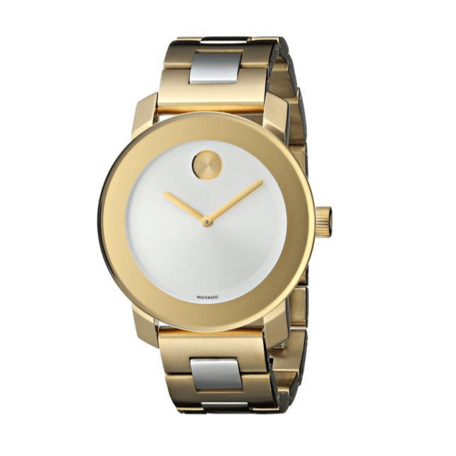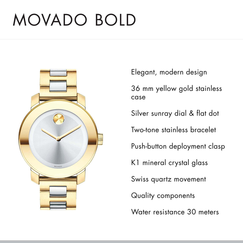 Yellow gold PVD stainless steel case with a two-tone (silver and yellow gold PVD) two-tone bracelet. Fixed yellow gold PVD bezel. Silver dial with yellow gold-tone hands. No markers. The Movado signature dot marks the 12 o'clock position. Dial Type: Analog. Quartz movement.