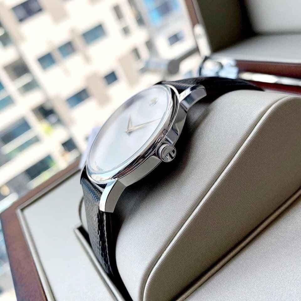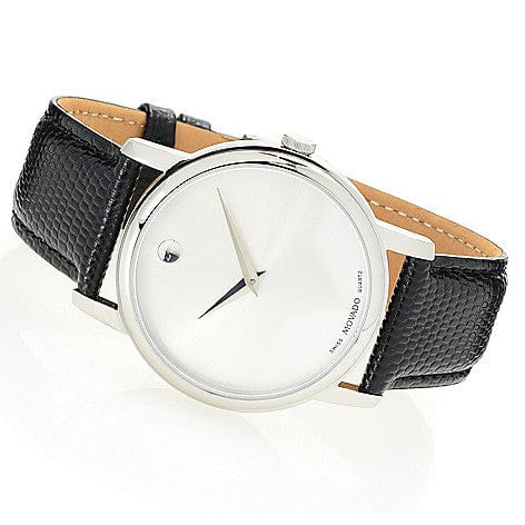 Stainless steel case with a black leather strap. Fixed stainless steel bezel. Silver dial with silver-tone hands. No markers. The Movado dot marks the 12 o'clock position. Dial Type: Analog. Quartz movement. Scratch resistant sapphire crystal. Pull / push crown. Solid case back. Round case shape.Case size: 40 mm. Case thickness: 8 mm. Band width: 21 mm. Tang clasp. Water resistant at 30 meters / 100 feet. Functions: hour, minute. Dress watch style. Watch label: Swiss Made. Movado Museum Quartz Silver Dial Men's Watch 2100001.