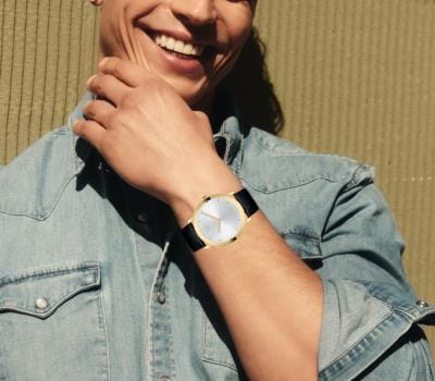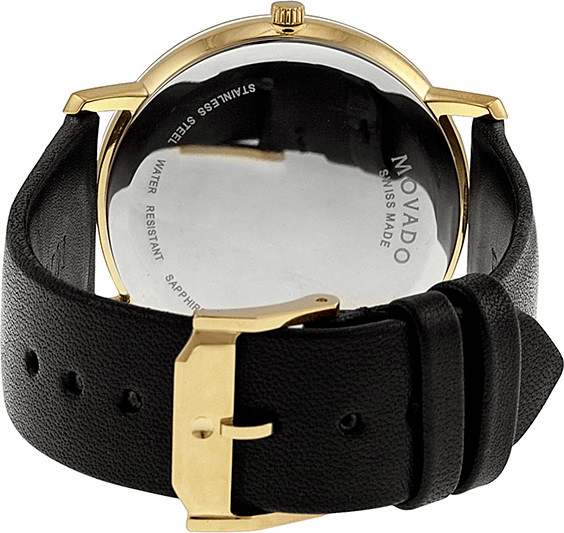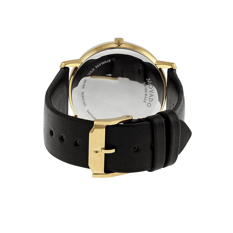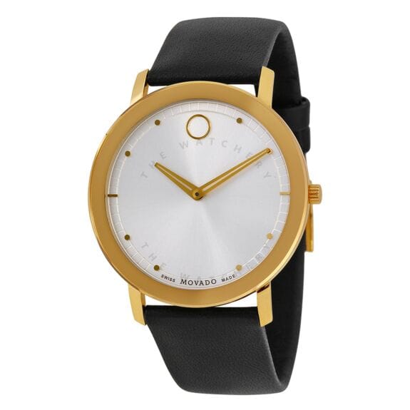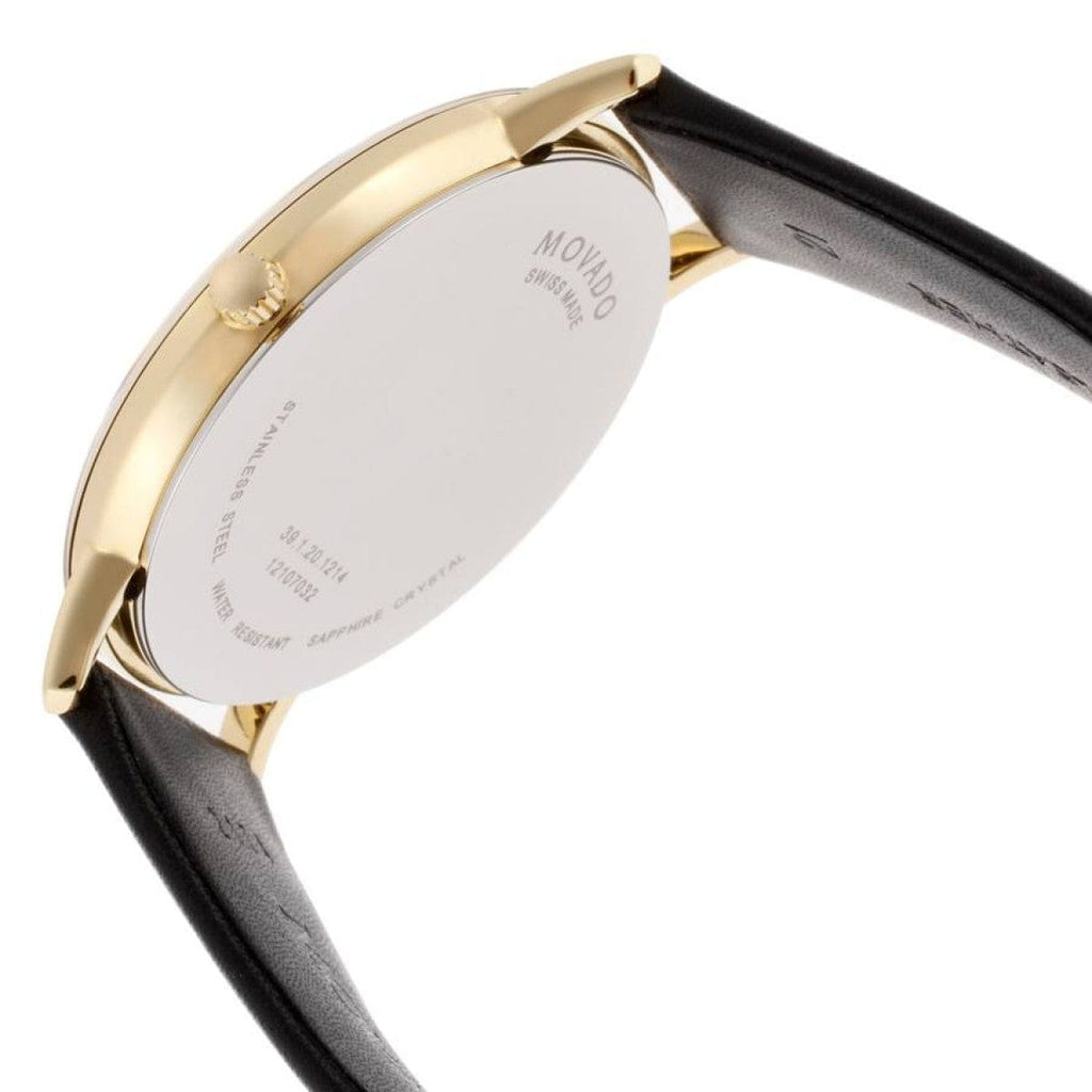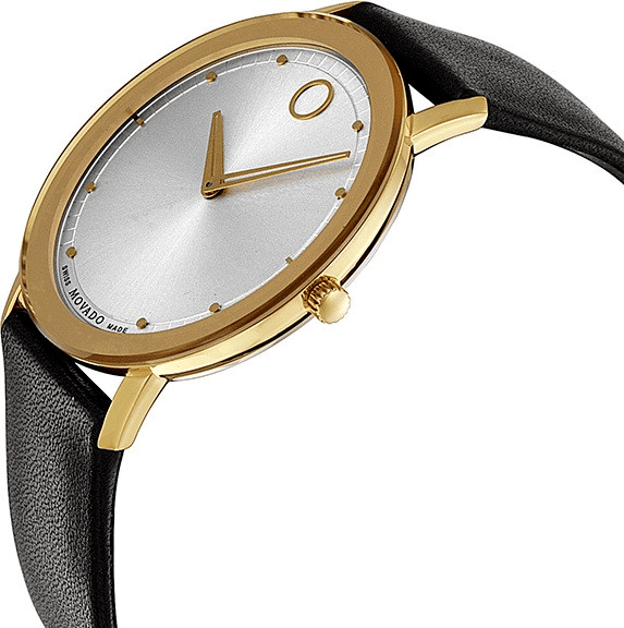 Gold-tone stainless steel case with a black leather strap. Fixed gold mirrored bezel. Silver dial with gold-tone hands and index hour markers. Minute markers around the outer rim. Movado dot marks the 12 o'clock position. Dial Type: Analog. Quartz movement. Scratch resistant sapphire crystal. Pull / push crown. Solid case back. Case diameter: 40 mm. Case thickness: 6 mm. Round case shape. Band width: 21 mm. Tang clasp. Water resistant at 30 meters / 100 feet. Functions: hour, minute. Casual watch style. Movado TC Gold Mirror Bezel Gold-tone Men's Watch 0606695.