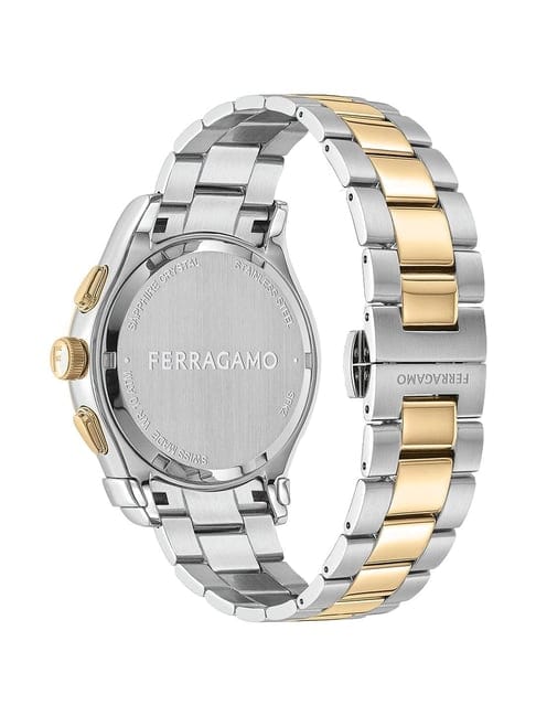 A must-have timepiece for all the watch aficionados, this men's analog watch from the collection by Ferragamo will be a perfect pick. The silver round dial is protected by a sapphire glass. It features a crown for time adjustment. The stainless steel strap comes in a two tone hue that further elevates the look of the timekeeper. Besides, it is completed with a fold over clasp to ensure a secure fit on the wrist.