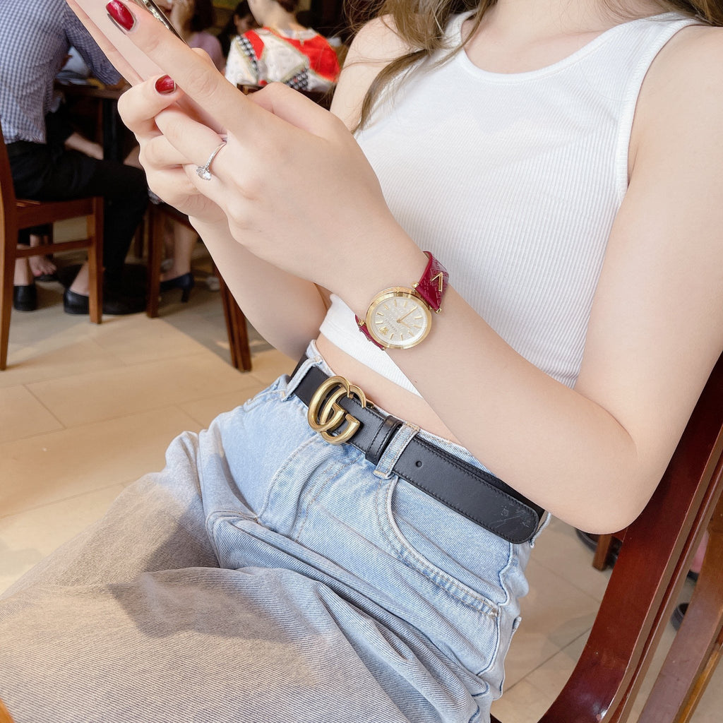 Yellow gold-tone stainless steel case with a red leather strap. Fixed yellow gold-tone bezel. Silver dial with yellow gold-tone hands and index hour markers. The Medusa Head logo appears at the 12 o'clock position. Dial Type: Analog. Quartz movement. Scratch resistant sapphire crystal. Solid case back. Round case shape. Case size: 36 mm. Band width: 18 mm. Deployment clasp. Water resistant at 50 meters / 165 feet. Functions: hour, minute. Dress watch style. Watch label: Swiss Made. Versace Quartz Silver Dial Ladies Watch VELS00519.