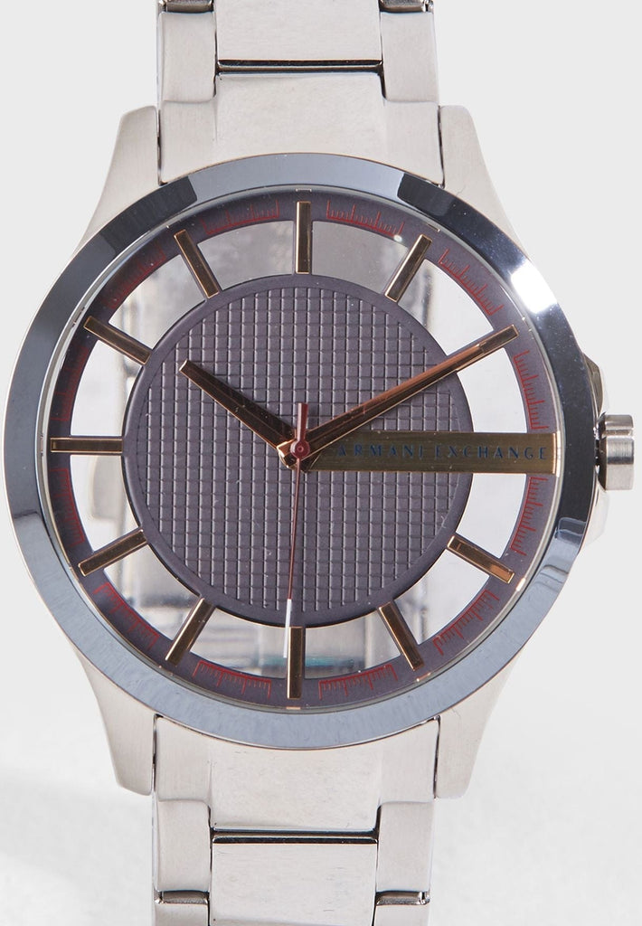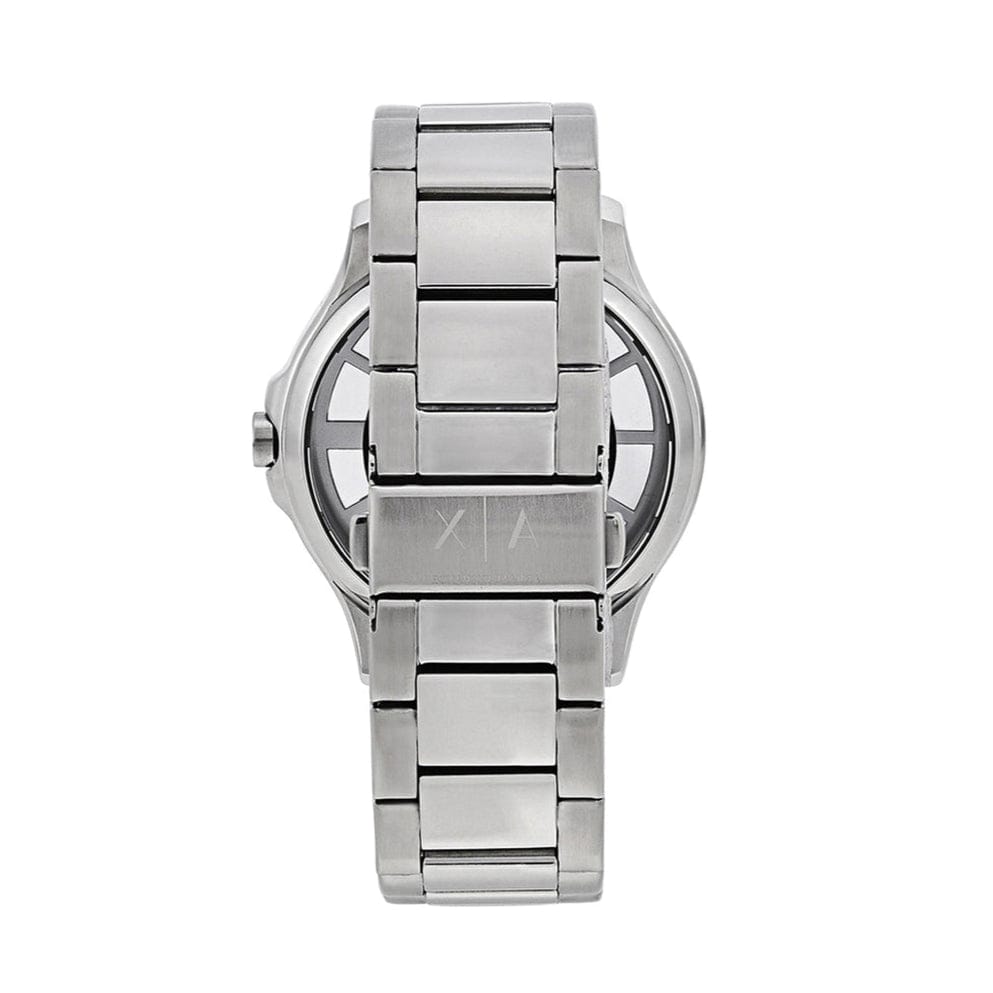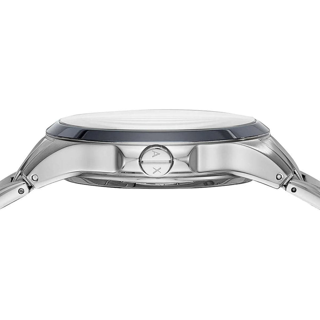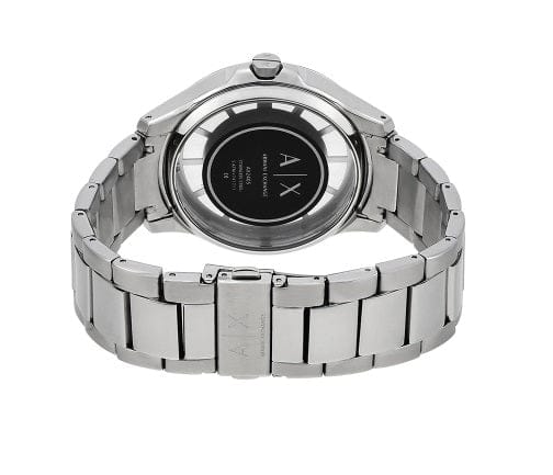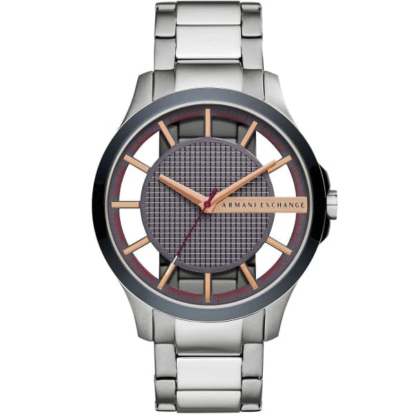 Stainless steel case and bracelet. Fixed stainless steel bezel. Grey dial with rose gold-tone hands and index hour markers. Minute markers around the outer rim. Dial Type: Analog. Quartz movement. Scratch resistant mineral crystal. Pull / push crown. Solid case back. Round case shape, case size: 46 mm, case thickness: 12 mm. Band width: 22 mm. Fold over clasp with a push button release. Water resistant at 50 meters / 165 feet. Functions: hour, minute, second. Dress watch style. Armani Exchange Grey Dial Stainless Steel Men's Watch AX2199.