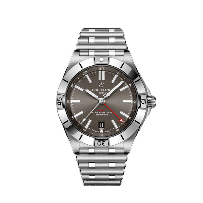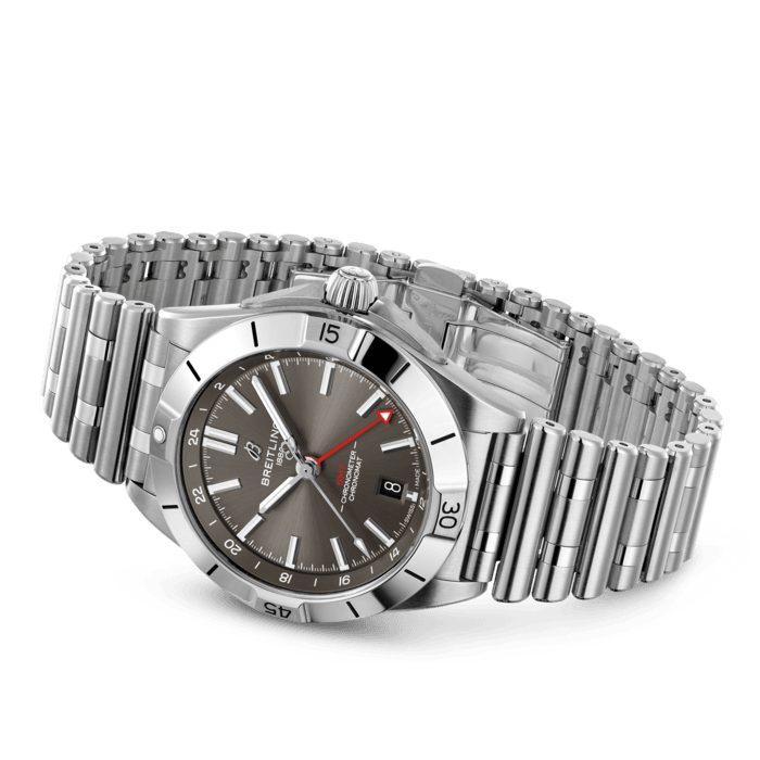 The Chronomat Automatic GMT 40 is Breitling’s tribute to travel, not only for its dual time zone display, but also because of its easygoing aesthetics. Subtle dial colors, combined with an all-steel case and bracelet, work with any wardrobe. Meanwhile, the tone-on-tone 24-hour scale lets the red GMT hand speak for itself. The Breitling Caliber 32 powers the GMT complication. Its 24-hour scale lets the user track a second time zone and know at a glance whether it’s day or night, while the “onion” crown (a classic Chronomat feature named for its fluted-dome shape) allows for easy adjustments.