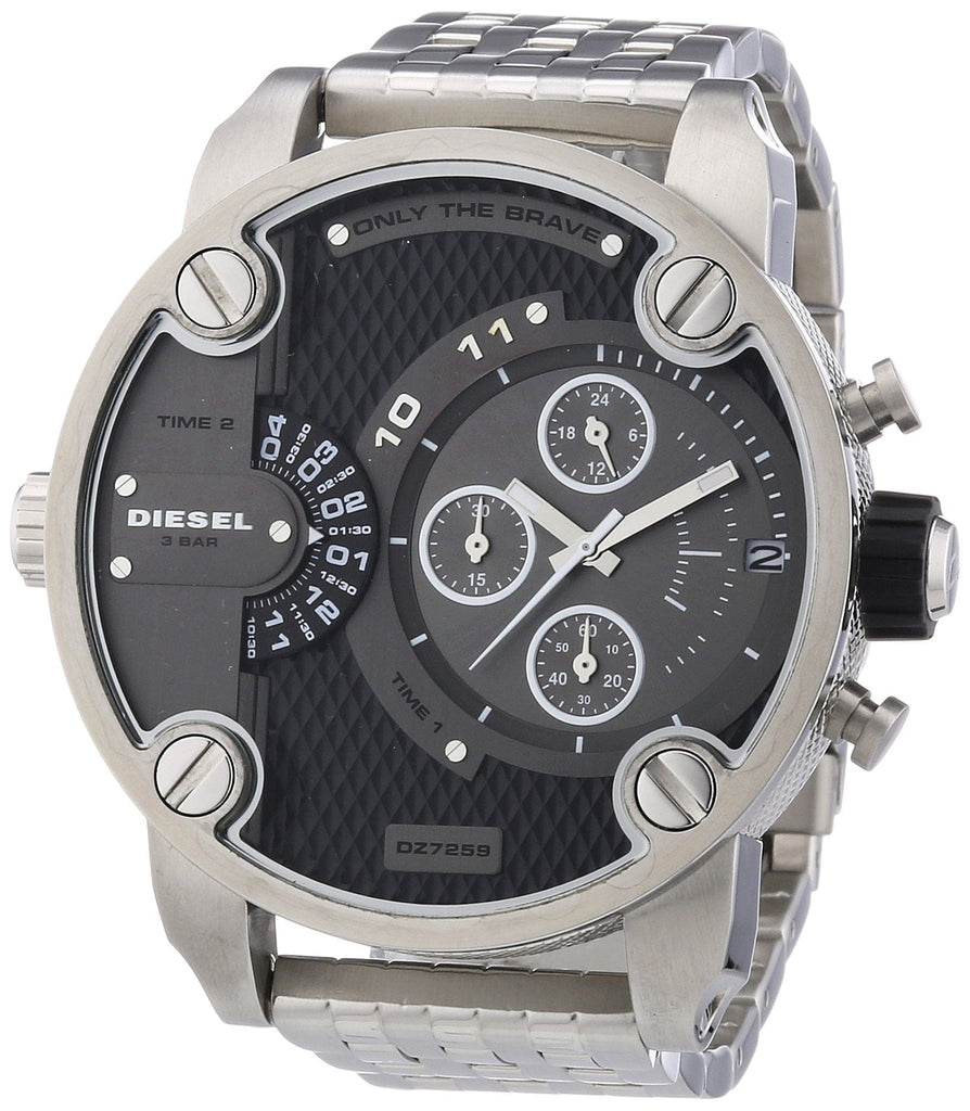 With its large size and bold design, Diesel's Little Daddy line defies its own name to produce Enormous style. This rendition features Silver Stainless Steel band and a bold Black and Grey textured dial.