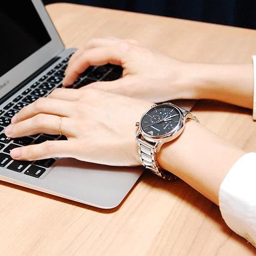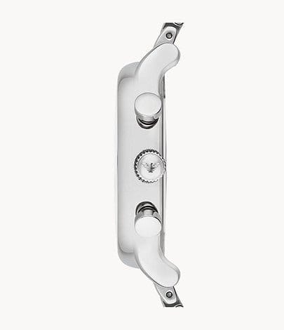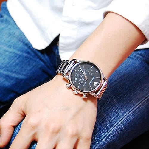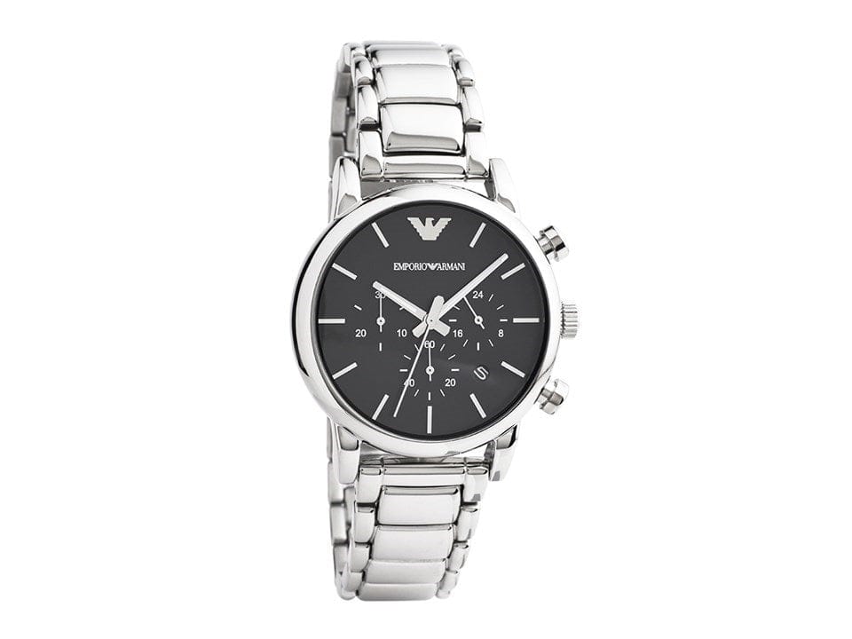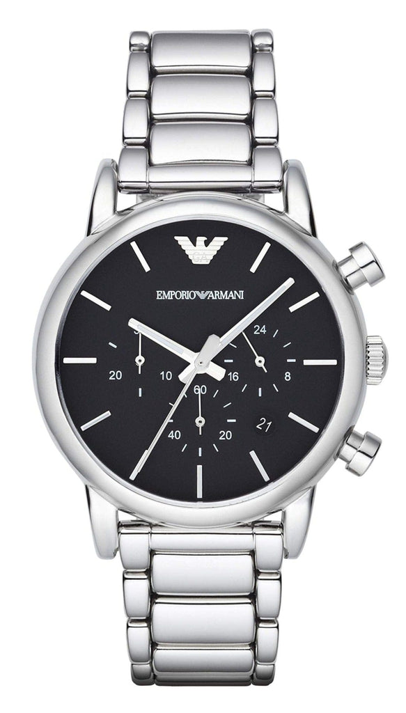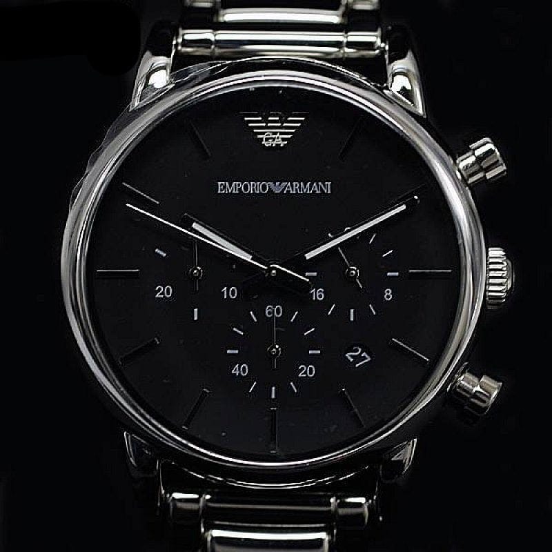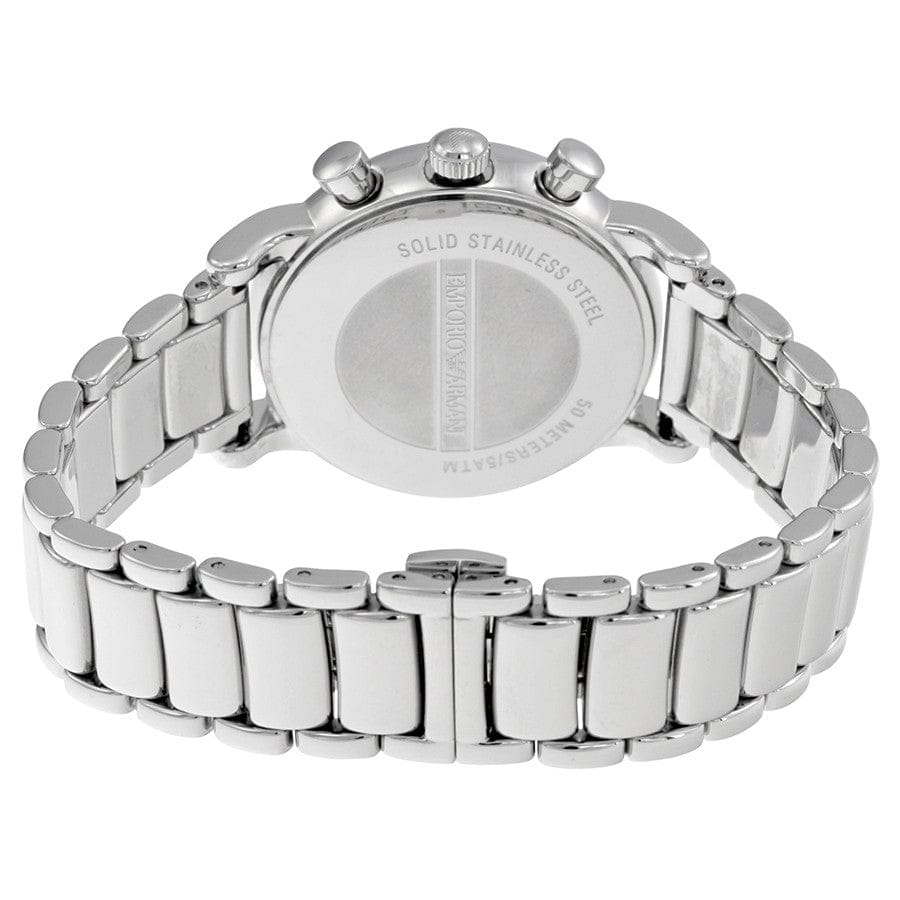 Stainless steel case with a stainless steel bracelet. Fixed stainless steel bezel. Black dial with luminous silver-tone hands and index hour markers. Minute markers around the outer rim. The Emporio Armani logo at the 12 o'clock position. Dial Type: Analog. Luminescent hands and markers. Date display between the 4 and 5 o'clock positions. Chronograph - three sub-dials displaying: 60 seconds, 30 minutes, and 24 hours. Quartz movement. Scratch-resistant mineral crystal. Pull/push crown. Solid case back. Case diameter: 41 mm. Case thickness: 12.3 mm. Round case shape. Band width: 20 mm. Fold-over clasp. Water-resistant at 50 meters / 165 feet. Functions: chronograph, date, hour, minute, second. Casual watch style. Emporio Armani Chronograph Black Dial Stainless Steel Men's Watch AR1853.
