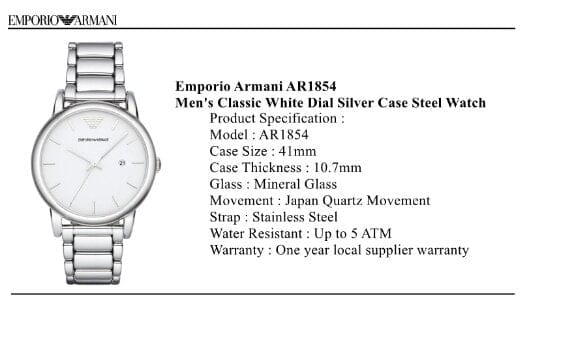 The anti-reflective mineral glass is resistant to shock and scratches, water resistant 50 meters 05 atmospheres. The bracelet is in polished and silver stainless steel, 18 mm wide, with a hidden push-button safety clasp. International warranty 02 years - Swiss Made - Luigi Collection - Emporio Armani AR1854