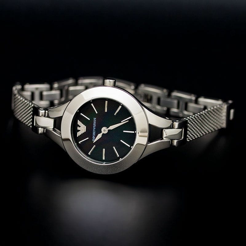The Womens Emporio Armani Watch AR7328 (AR7328) is available to buy. It features a stainless steel bracelet strap, a high polished stainless steel case and has a black with silver accents and two hand movement dial. The AR7328 comes with an official Emporio Armani Watches 2 year guarantee.