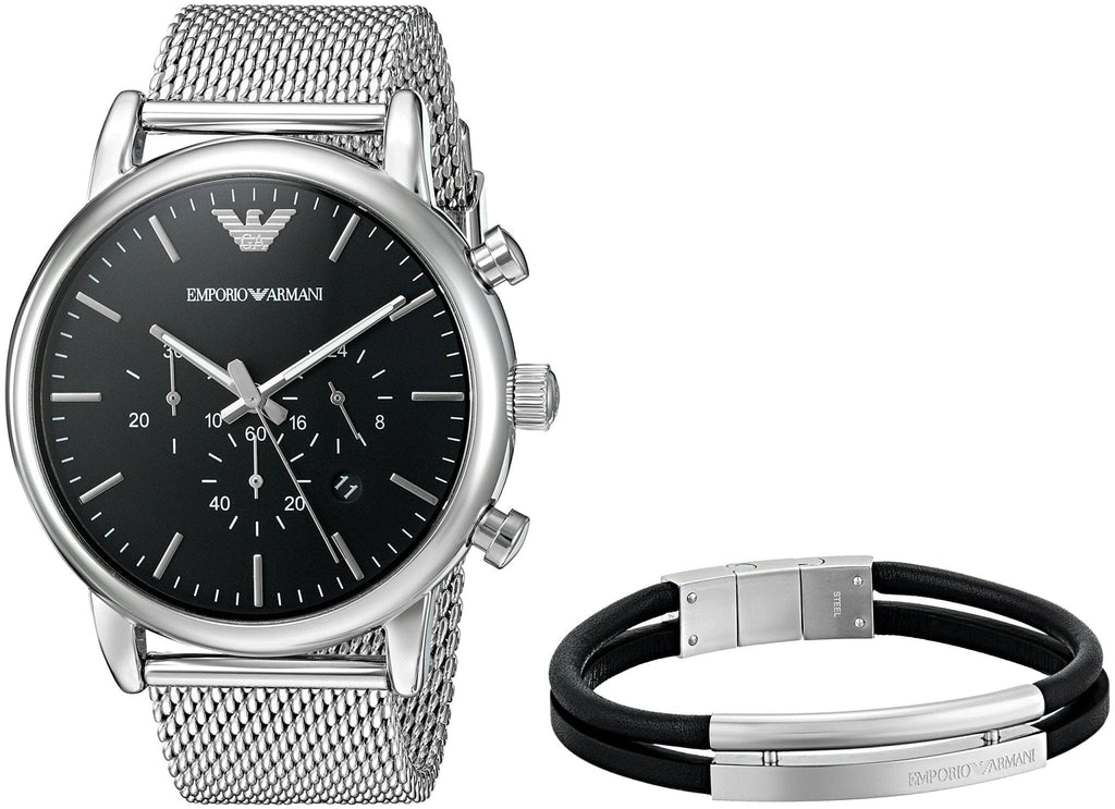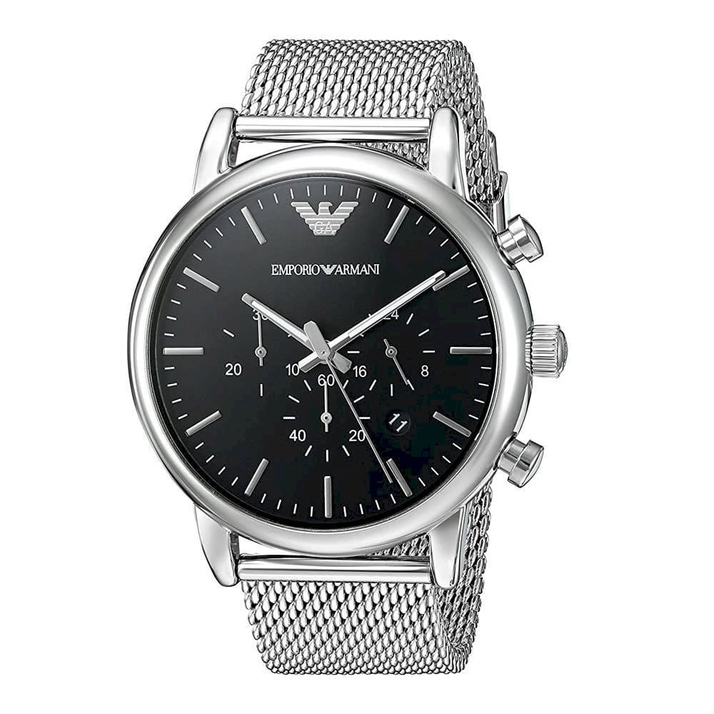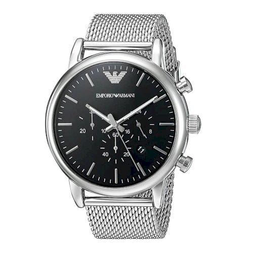 Stainless steel case with a stainless steel mesh bracelet. Fixed stainless steel bezel. Black dial with silver-tone hands and index hour markers. Minute markers around the outer rim. The Emporio Armani logo appears at the 12 o’clock position. Dial Type: Analog. Date display between the 4 and 5 o’clock positions. Chronograph – three sub-dials displaying: 60 second, 30 minute and 24 hour. Quartz movement. Scratch resistant mineral crystal. Pull / push crown. Solid case back. Case size: 46 mm. Case thickness: 12 mm. Round case shape. Band width: 22 mm. Deployment clasp. Water resistant at 50 meters / 165 feet. Functions: chronograph, date, hour, minute, second. Additional Info: in general, suitable for short periods of recreational swimming, but not diving or snorkeling. Casual watch style. Emporio Armani Luigi Chronograph Men’s Watch AR8032.