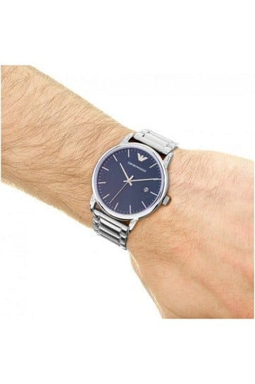 - Dynamic styling drives the versatile look of this Emporio Armani watch. The blue sunray dial is accented with silver-tone indexes and round date window. The look is complete with a polished silver-tone three-link bracelet.