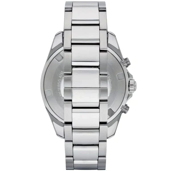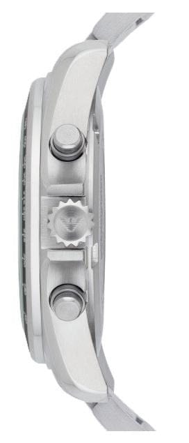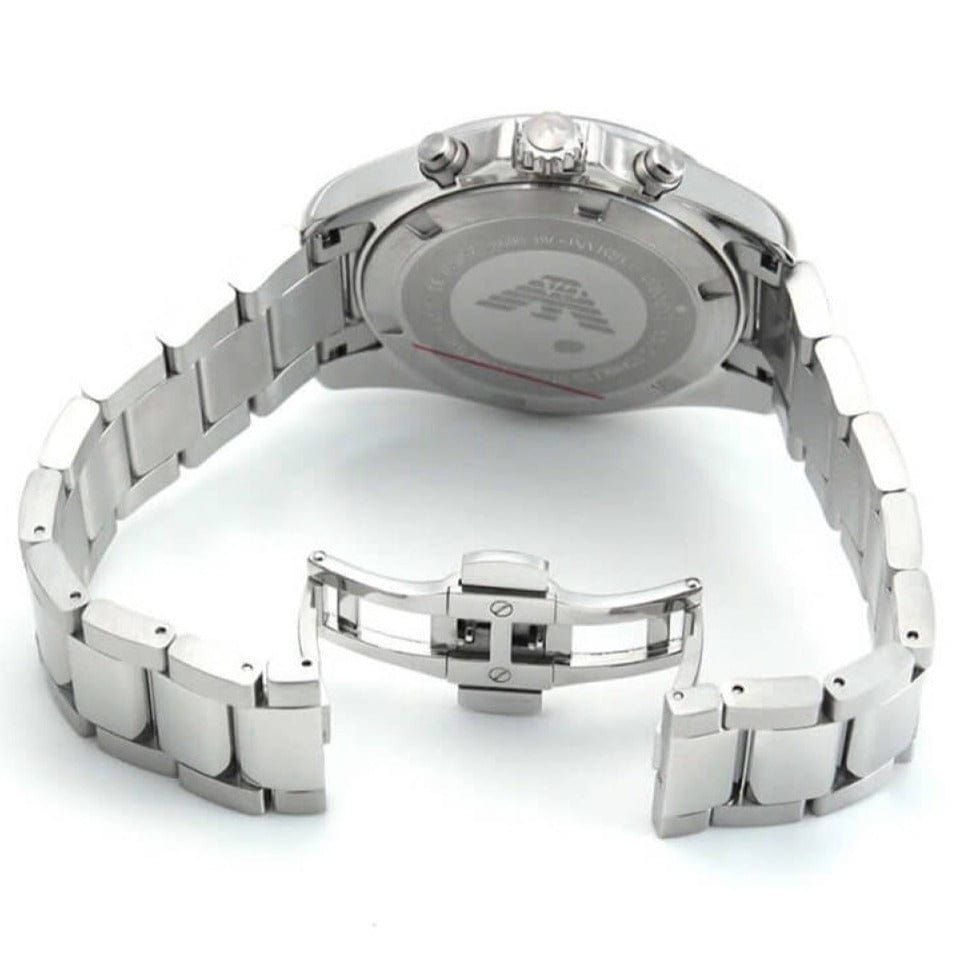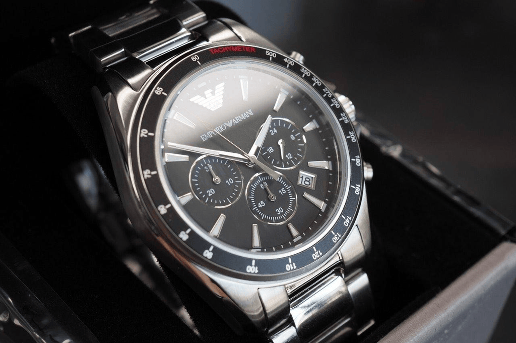 Featuring classy and dressy Emporio Armani watch in a black dial and stainless steel bracelet. Features chronograph function also known as timer/stopwatch. Date indicator sits between 4 and 5 o'clock: Note: very minor scuff near buckle links due to buckle rubbing against the steel. Not visible when wearing since buckle is usually hidden when wearing a watch
