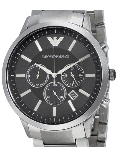 Silver-tone stainless steel case with a silver-tone stainless steel bracelet. Fixed silver-tone stainless steel bezel. Black dial with silver-tone lance-style shape hands and index hour markers. Emporio armani logo at the 12 o'clock position. minute markers around the outer rim. Dial Type: Analog. Date display between 4 and 5 o'clock position. Chronograph - three sub-dials displaying: 60 second, 60 minute and 24 hour. Quartz movement. Scratch resistant mineral crystal. Pull / push crown. Solid case back. Round case shape, case size: 46 mm, case thickness: 12 mm. Band width: 22 mm. Deployment clasp. Water resistant at 50 meters / 165 feet. Functions: chronograph, date, hour, minute, second. Casual watch style. Emporio Armani Sportivo Chronograph Black Dial Steel Men's Watch AR2460.