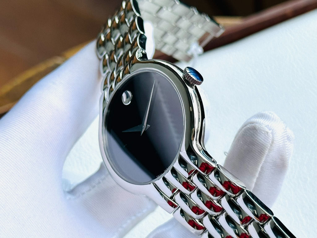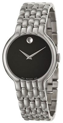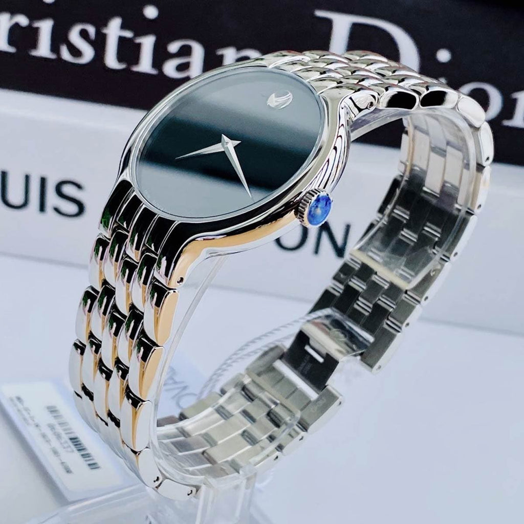 This Movado Classic Quartz watch for men features a sleek black dial and a silver steel strap. Crafted with precision and style, this watch is perfect for any formal occasion. Its reliable quartz movement ensures accurate time-keeping. A must-have accessory for the modern man.