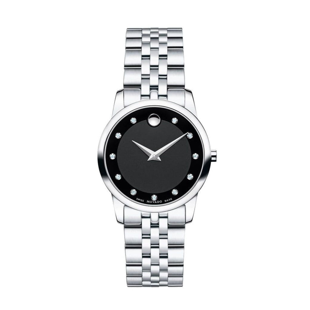 This Movado Museum Classic watch has a black dial and silver steel strap, creating a sleek and modern look. The watch is specially designed for women, offering both elegance and functionality. With its iconic Museum dial and Swiss quartz movement, this watch is a must-have for any stylish woman.