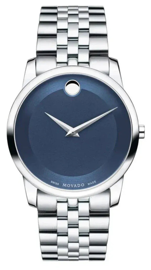 This Movado Museum Classic watch for men features a striking blue dial and a sleek silver steel strap. Designed with a modern aesthetic, it exudes sophistication and style. With its precise timekeeping and durable construction, this watch is the perfect companion for any occasion. Elevate your look with this iconic timepiece.