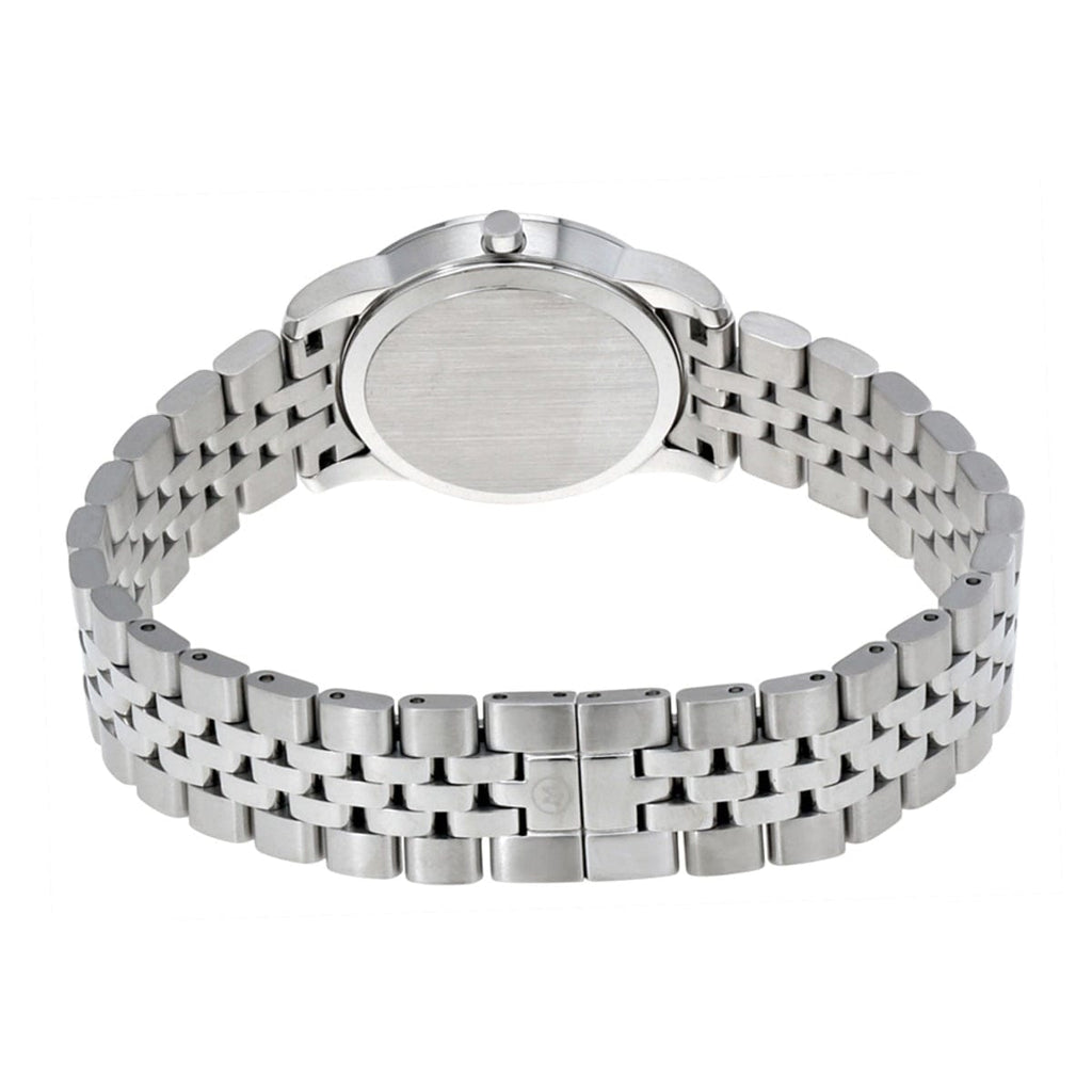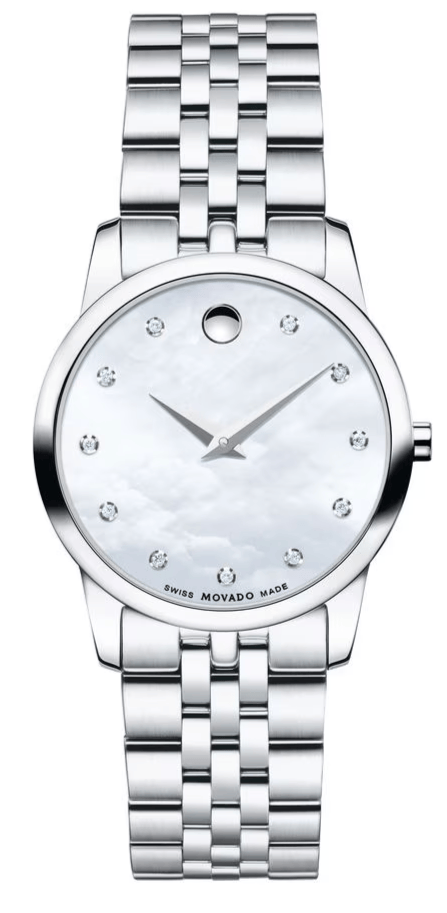 Women’s Museum Classic watch, 28 mm stainless steel case, round white mother-of-pearl dial with 11 diamond markers (0.043 t.c.w.) and silver-toned concave signature dot and dauphine hands, stainless steel link bracelet with deployment clasp, sapphire crystal, Swiss quartz movement.