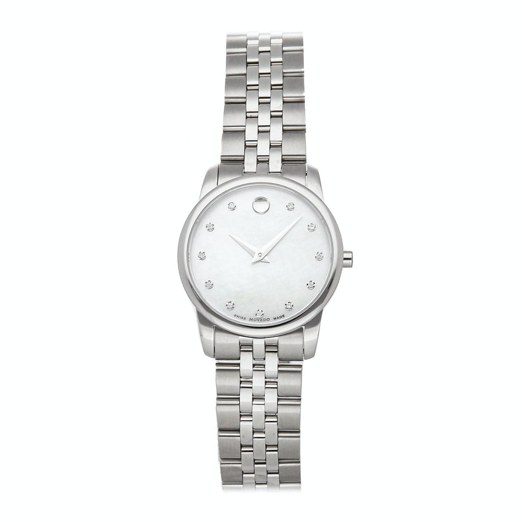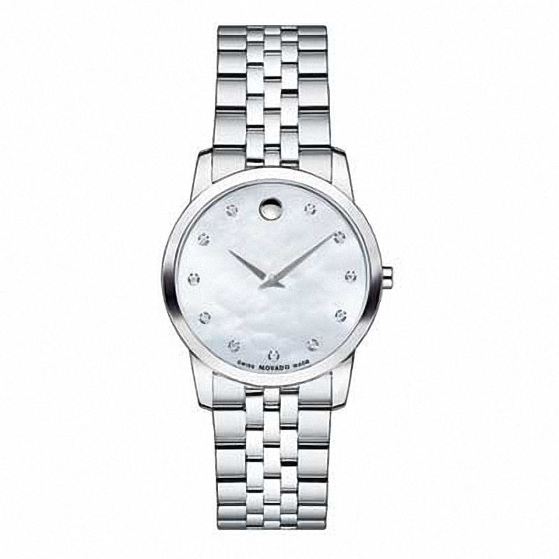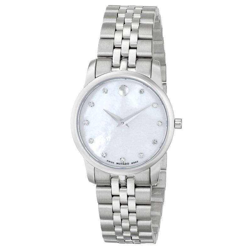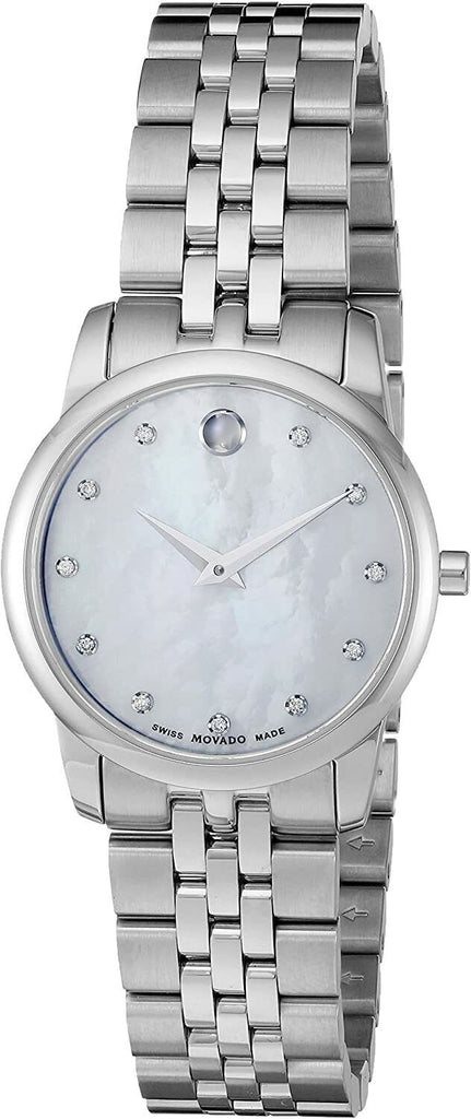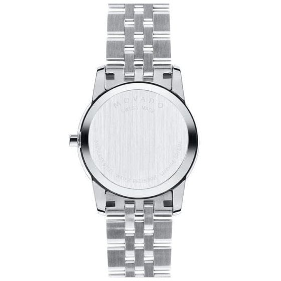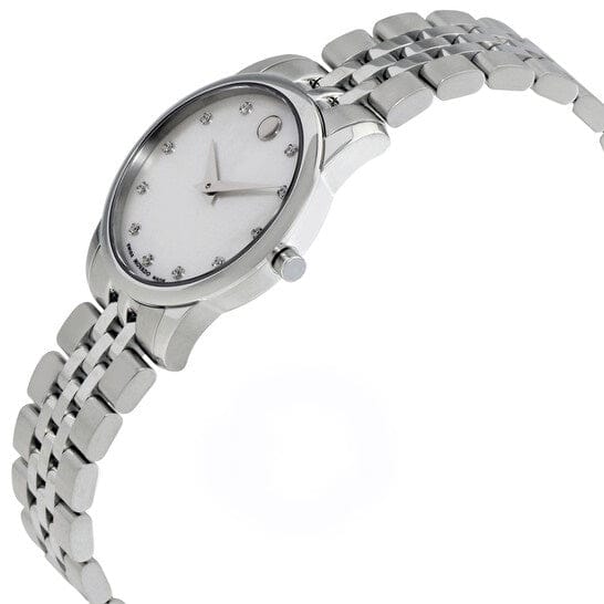 Elegance personified, this ladies' Movado watch features a round mother-of-pearl Museum® dial with silver-tone hands and hour markers stainless steel case. The reliable Swiss quartz movement ensures accurate time keeping. This watch is water-resistant and the polished stainless steel link bracelet secures with a deployment clasp