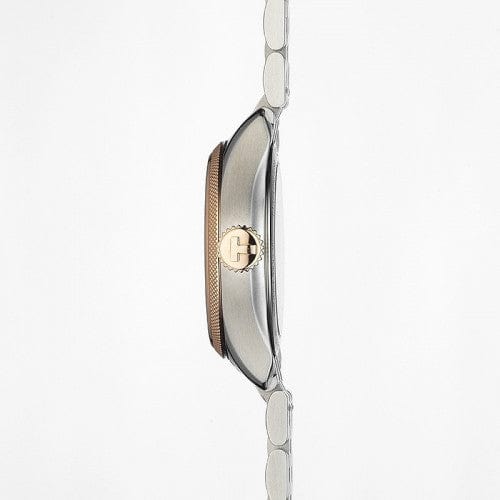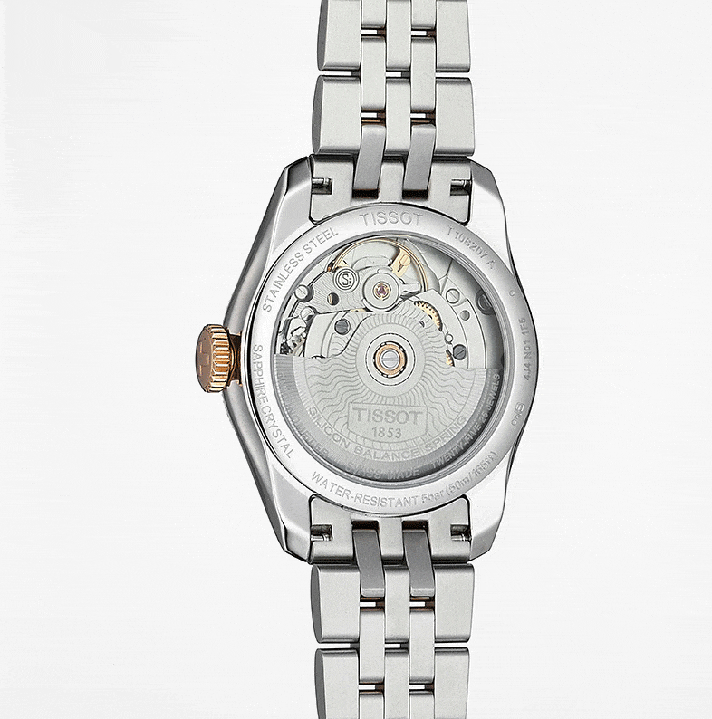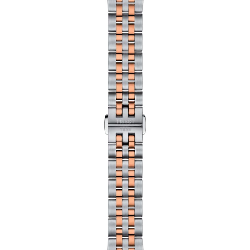 This ladies' model of the Tissot Ballade with chronometer certification has a white mother-of-pearl dial with Arabic numerals and indices and a scratch-resistant sapphire crystal. The bicolor 316L stainless steel case with rose gold PVD coating has a transparent case back and the solid bicolor 316L stainless steel bracelet with rose gold PVD coating has a butterfly clasp with pushers.