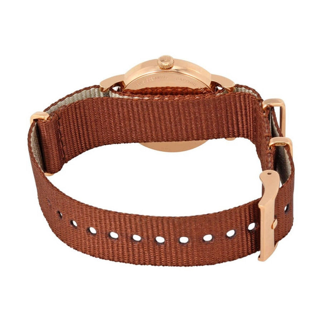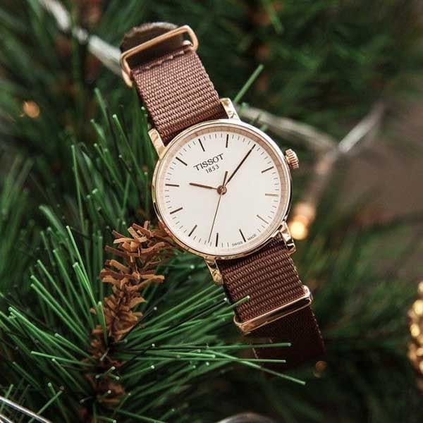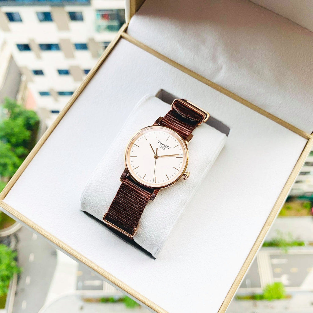 Rose gold PVD stainless steel case with a brown nylon strap. Fixed rose gold PVD bezel. White dial with rose gold-tone hands and index hour markers. Minute markers around the outer rim. Dial Type: Analog. Quartz movement. Scratch resistant sapphire crystal. Pull / push crown. Solid case back. Case size: 30 mm. Case thickness: 6.15 mm. Round case shape. Tang clasp. Water resistant at 30 meters / 100 feet. Functions: hour, minute, second. Casual watch style. Tissot Everytime White Dial Ladies Watch T1092103703100.