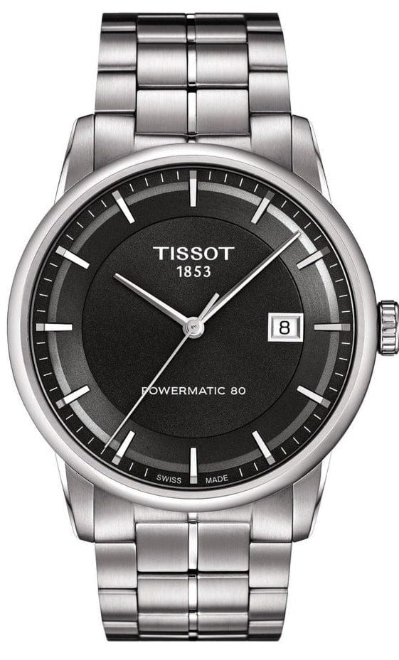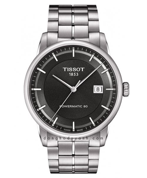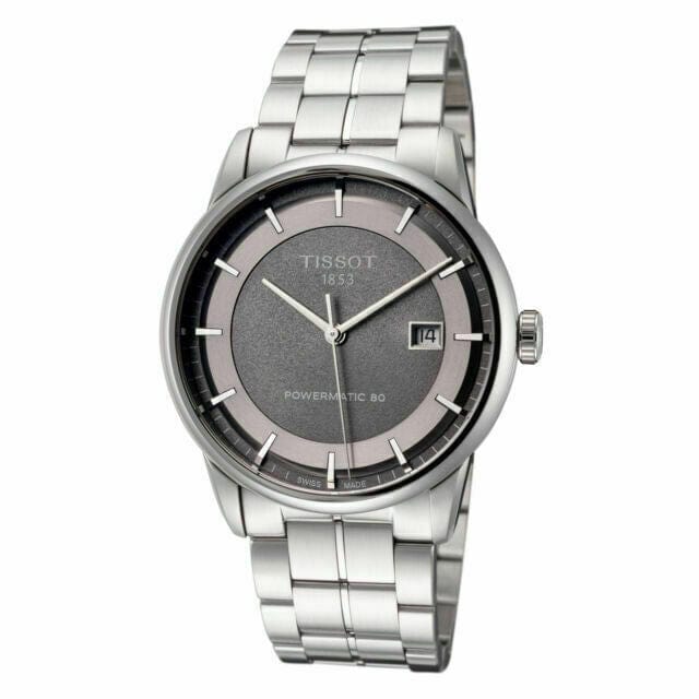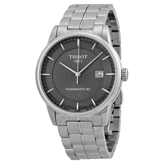 Case thickness: 9.75 mm. Round case shape. Deployment clasp with a push button release. Water resistant at 50 meters / 165 feet. Functions: date, hour, minute, second. Dress watch style. Watch label: Swiss Made. Tissot Luxury Powermatic 80 Anthracite Dial Stainless Steel Men's Watch T0864071106100.