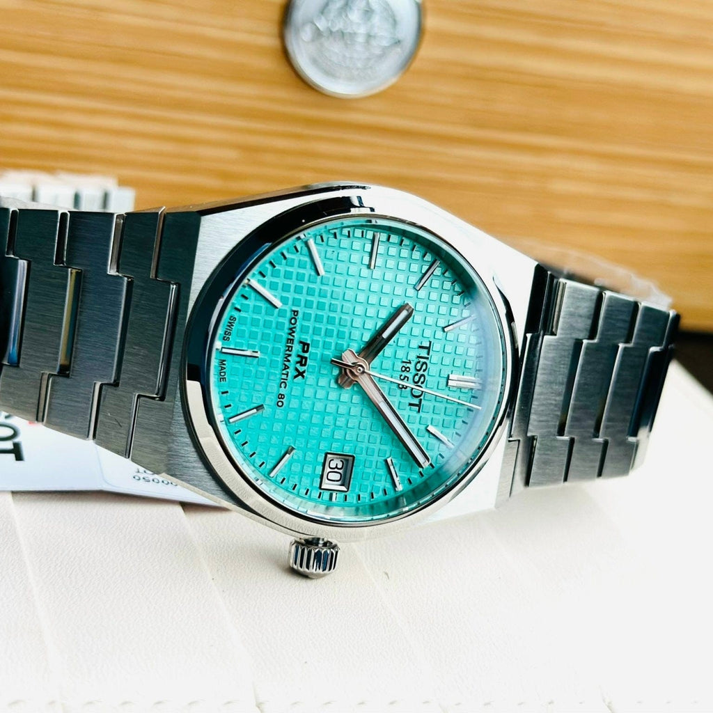 Tissot PRX 35mm Powermatic 80 , a perfect balance between timeless appeal and modern craftsmanship. inspired by its famous predecessor from 1978. The distinctive waffle dial pattern adds an extra level of elegance to the automatic model.