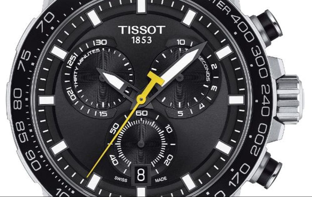 The Tissot T125.617.17.051.02 watch combines a 46mm round shaped stainless-steel case and black leather strap with textile detailing and a traditional buckle. It has a black analogue dial with two black luminescent hands with a yellow second tracker. Date is visible at position 6 with black chronograph sub dials and a tachymeter scale on the bezel, which is protected beneath sapphire crystal glass. Power is generated by the quartz movement. This model also has a water resistance of up to 100 metres.