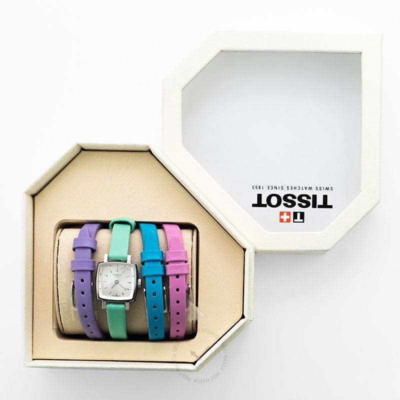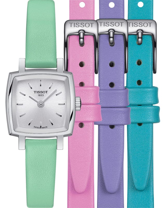Brand New Authentic Tissot Lovely Silver Dial Leather Strap Women's Watch Model T058.109.16.031.01. Stainless Steel case with Green Leather (Includes three additional leather Straps) strap. Tang clasp. Dial description: Silver tone hands and Index hour markers on a Silver dial. Battery Operated Quartz movement. Watch functions: Hour, Minute. Scratch Resistant Sapphire crystal. Square case shape. Case size: 20mm. Case thickness: 7.1mm. 30 Meters - 100 Feet water resistant. 2 year warranty. Also known as model: T0581091603101.