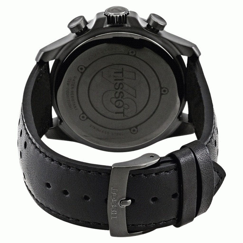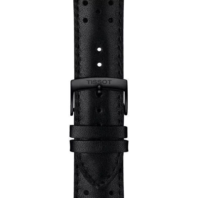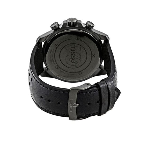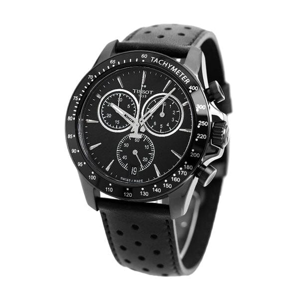 Black dial enhanced by luminous silver-tone hands. Black PVD stainless steel case with a black perforated leather band. Quartz movement. 100 meters / 330 feet water resistance. Fixed bezel. Scratch Resistant Sapphire crystal. Solid caseback. Tang clasp. Case size 42.5 mm x 11.22 mm. Band 20 mm x 8 incheslong. Tissot T106.417.36.051.00 T-Sport V8 Watch.