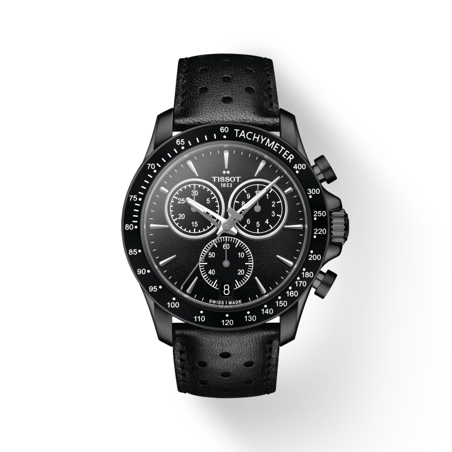 The Tissot V8 is a powerful engine for the wrist. The bold chronographs confidently take their positions on the Tissot product 'grid' with their dashboard-inspired counters and tachymeter bezels.
