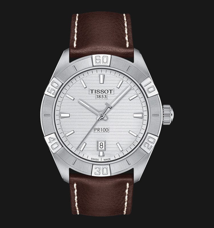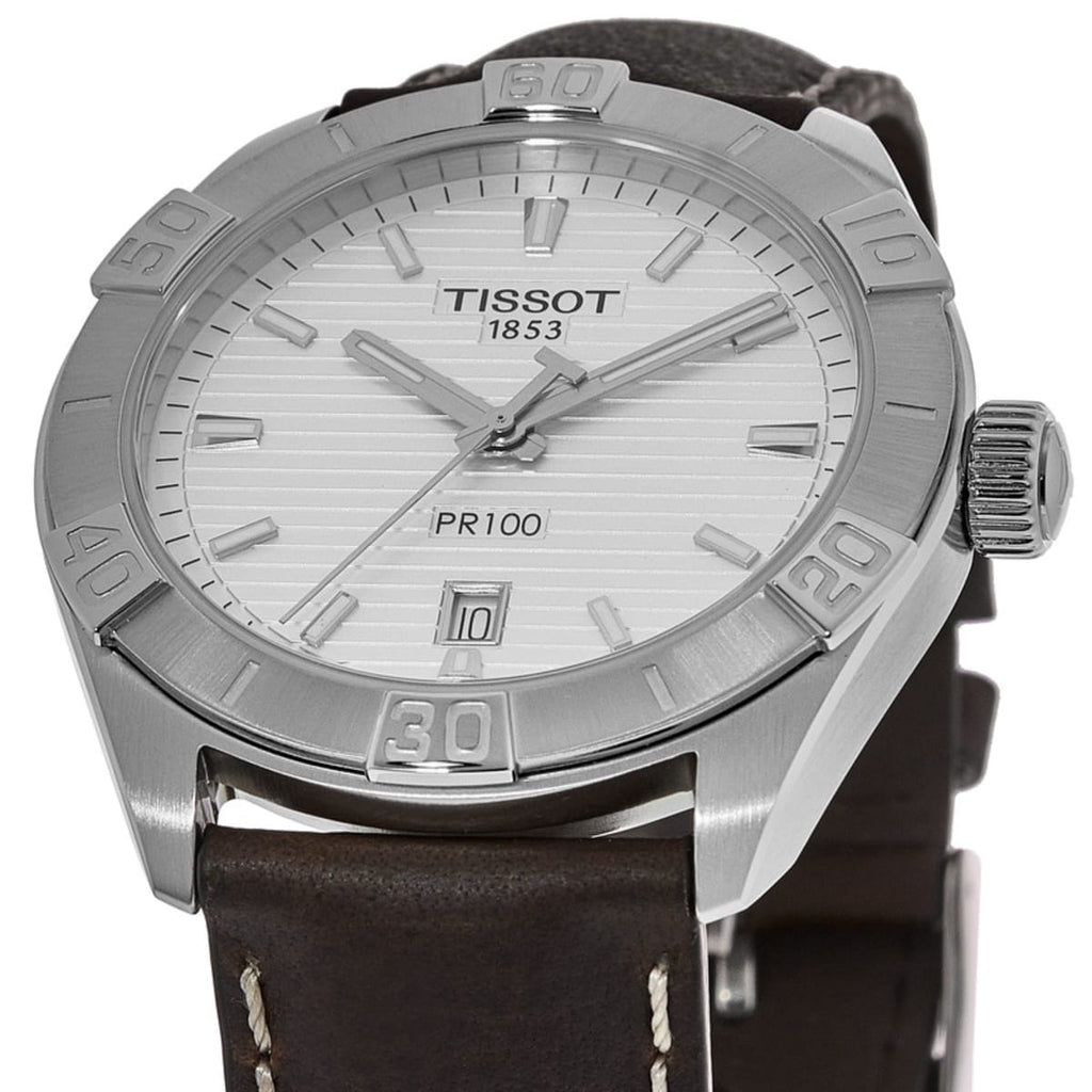 316L stainless steel case with a brown leather strap. Fixed stainless steel bezel. Silver dial with luminous silver-tone hands and index hour markers. Minute markers around the outer rim. Dial Type: Analog. Luminescent hands and markers. Date display at the 6 o'clock position. ETA caliber F06.115 quartz movement. Scratch resistant sapphire crystal. Pull / push crown. Solid case back. Round case shape. Case size: 42 mm. Case thickness: 9.4 mm. Band width: 22 mm. Fold over clasp with a safety release. Water resistant at 100 meters / 330 feet. Functions: date, hour, minute, second, battery eol indicator. Pr100 Series. Casual watch style. Watch label: Swiss Made. Tissot PR100 Quartz Silver Dial Men's Watch T101.610.16.031.00.