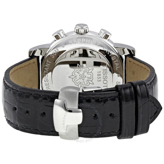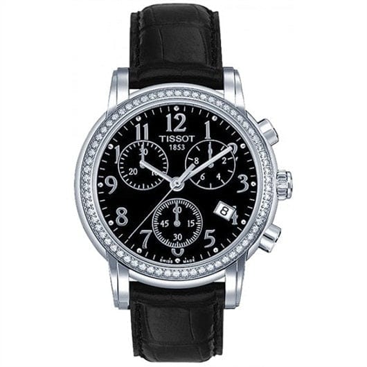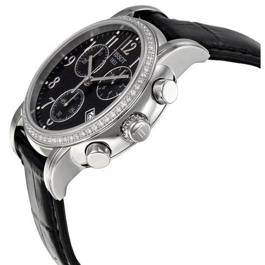 Stainless steel case with a black leather strap. Fixed silver-tone bezel set with crystals. Black dial with silver-tone hands and Arabic numeral hour markers. Minute markers appear around the outter rim. Dial Type: Analog. Date display at the 4 o'clock position. Chronograph - three sub-dials displaying: 30 minutes, 60 seconds and 1/10 seconds. Quartz movement. Scratch resistant sapphire crystal. Screw down crown. Solid case back. Case diameter: 35 mm. Case thickness: 10 mm. Fold over clasp. Water resistant at 30 meters / 100 feet. Functions: hours, minutes, seconds, 1/10 seconds, chronograph and date. Casual watch style. Watch label: Swiss Made. Tissot Dressport Chronograph Black Leather Ladies Watch T0502171605201.