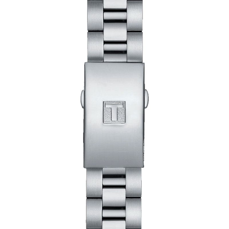 Stainless steel case with a stainless steel bracelet. Fixed stainless steel bezel. Silver dial with luminous silver-tone hands and index hour markers. Minute markers around the outer rim. Dial Type: Analog. Luminescent hands and markers. Date display at the 4 o'clock position. Chronograph - three sub-dials displaying: 60 second, 30 minute and 12 hour. ETA caliber G15.212 AA quartz movement. Scratch resistant sapphire crystal. Solid case back. Round case shape. Case size: 38 mm. Case thickness: 10 mm. Band width: 19 mm. Fold over clasp. Water resistant at 30 meters / 100 feet. Functions: chronograph, date, hour, minute, second. Pr 100 Sport Chic Series. Sport watch style. Watch label: Swiss Made. Tissot PR 100 Sport Chic Chronograph Quartz Silver Dial Watch T101.917.11.031.00.
