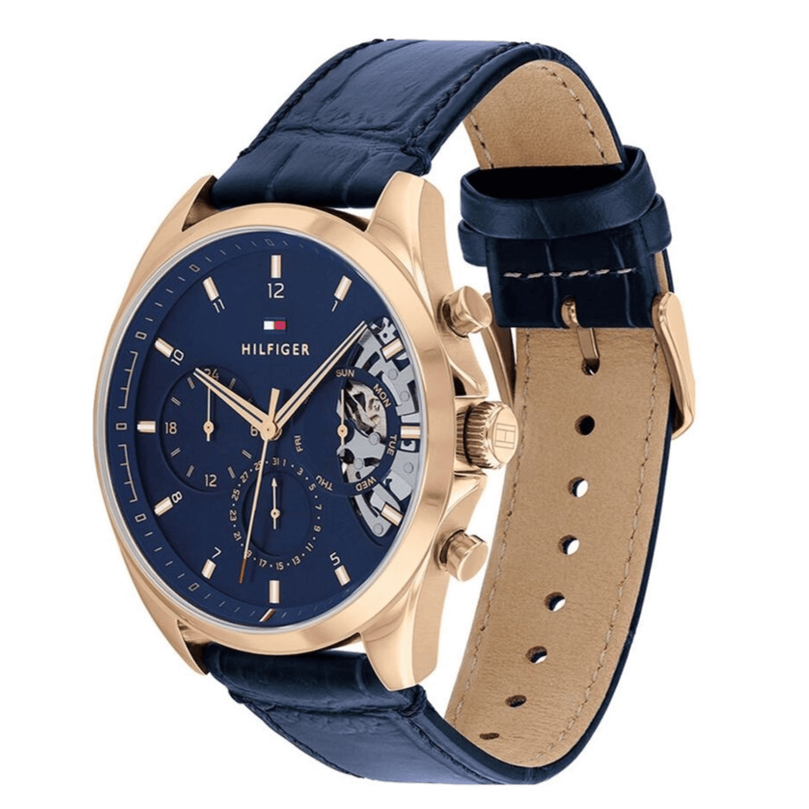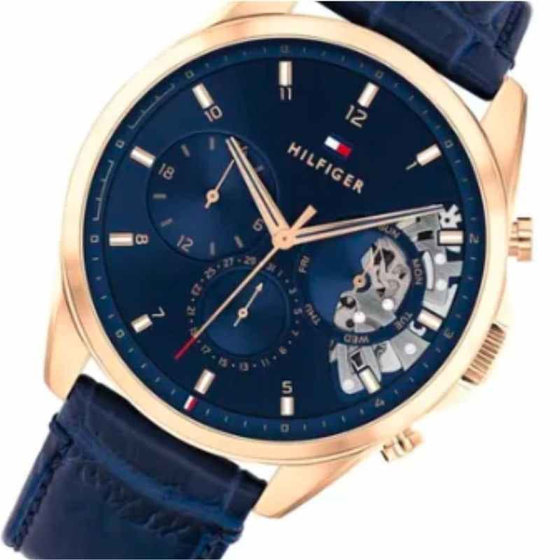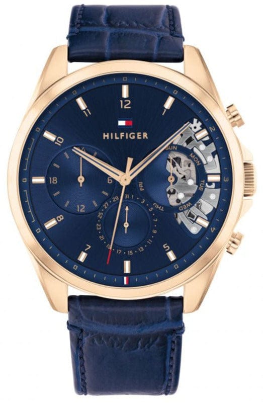 The Mens Tommy Hilfiger Watch 1710451 (1710451) features a blue leather strap, an ip rose gold stainless steel case and has a blue with three hand movement, sub dial day/date display dial. The 1710451 comes with an official Tommy Hilfiger Watches 2 year guarantee.