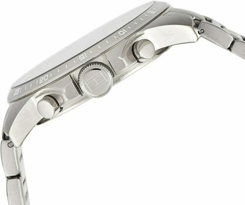 Distinctive textures add eye-catching appeal to this cool, confident multi-function men's watch in solid stainless steel. Featuring a protected crown with etched flag/iconic stripe detail, and sport bezel, the 46mm case is presented on an H-link bracelet with a bold middle row of vertically textured links.