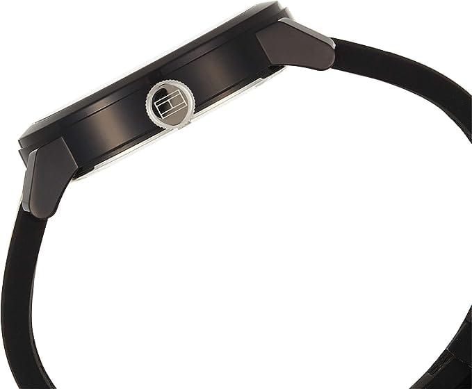 Expertly designed for men, the Tommy Hilfiger Denim Black Dial Black Rubber Strap Watch (1791326) boasts a sleek and sophisticated design. With its durable black rubber strap and black dial, this watch exudes both style and functionality. Perfect for any occasion, this timepiece is a must-have for the modern man.