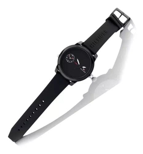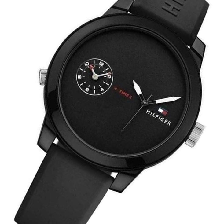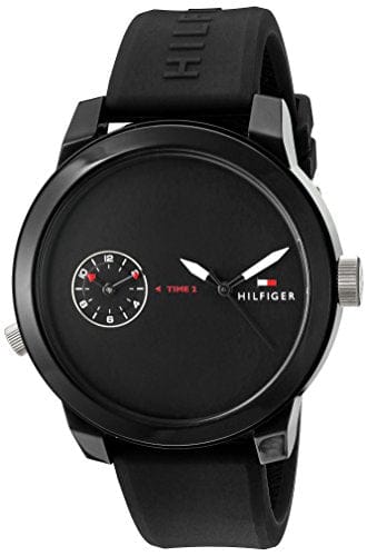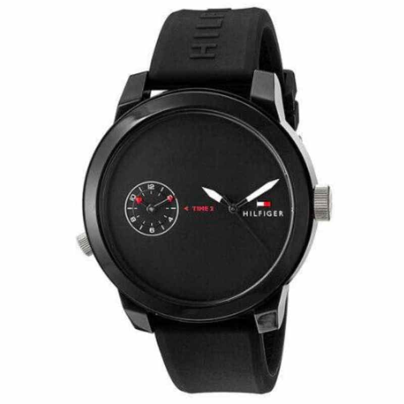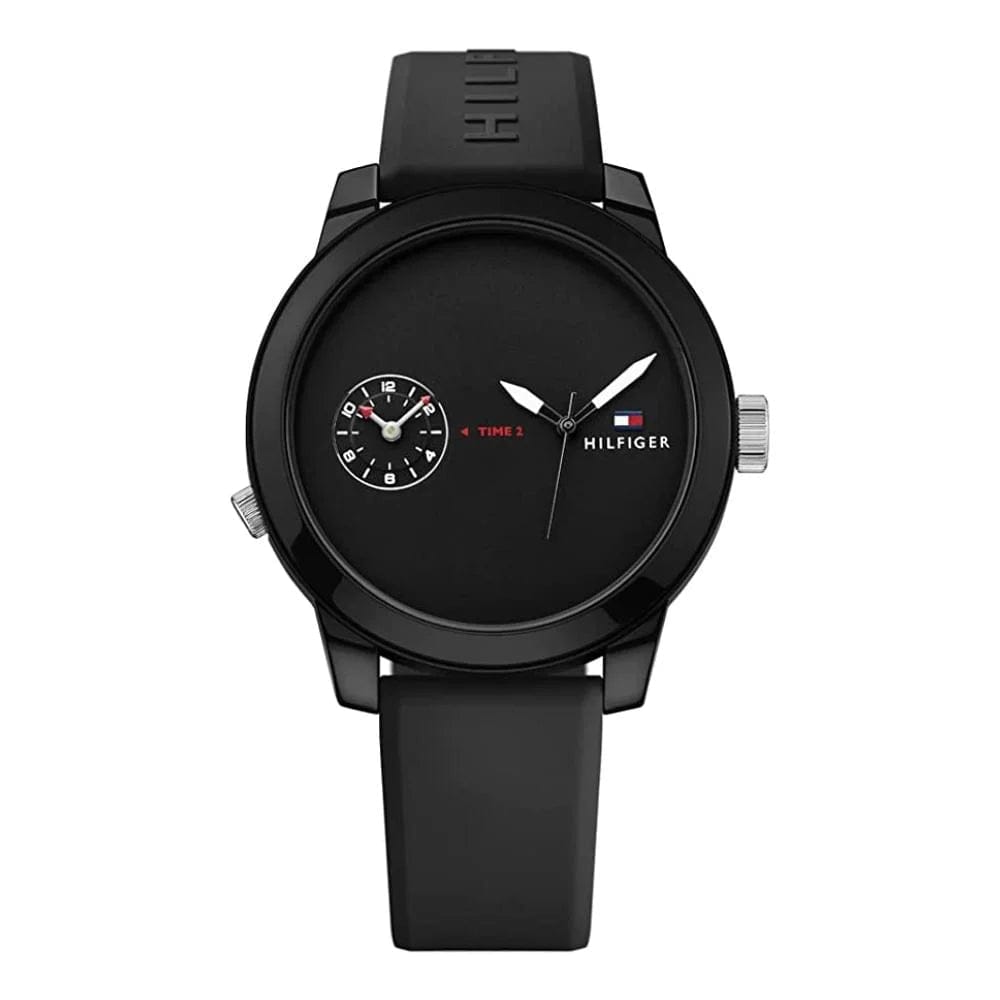 Tommy Hilfiger men's watch. Because timing is everything. Our modern-chic version of the sport watch features a sleek Black Silicone strap, with a Black-toned face and case. Nothing is cooler than the side-by-side, duel-dial placement.