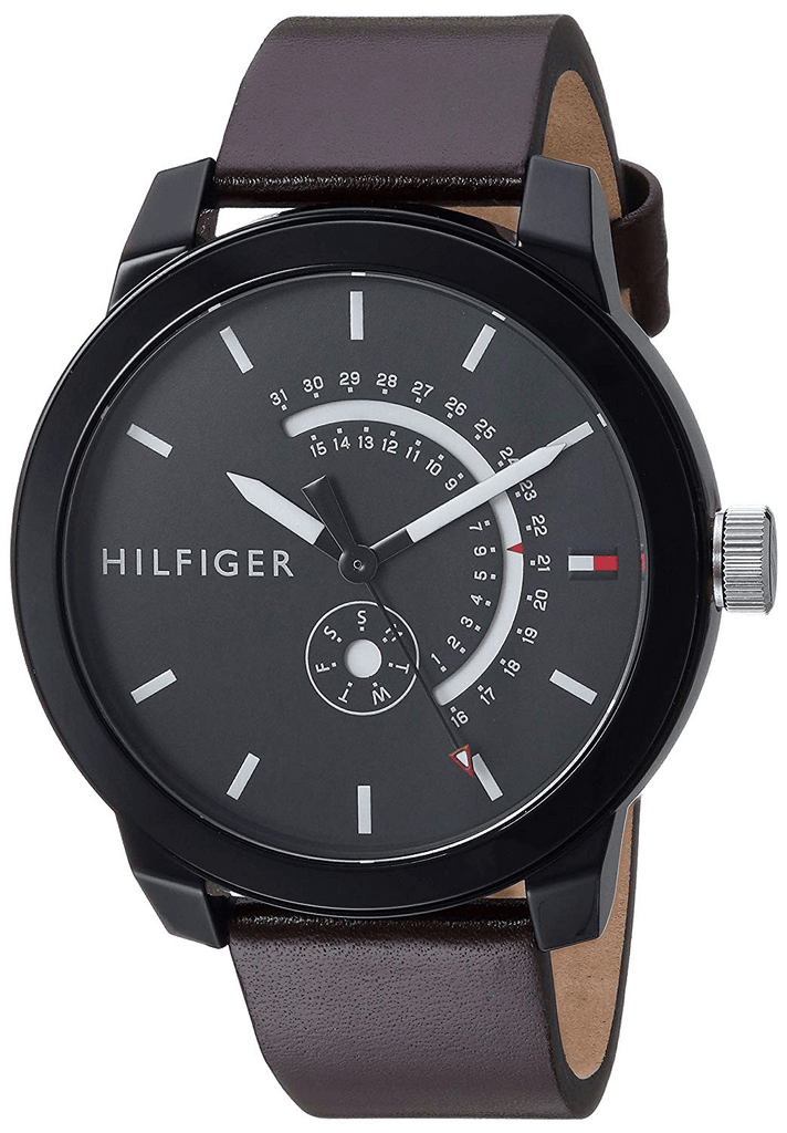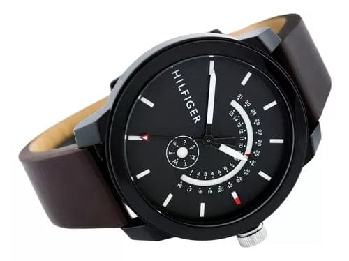 Tommy Heritage gets an iconic twist in this sport collection for him. The thermoplastic case features a multifunction dial with day and date openings, accented with the TH flag at 3 o'clock Men's black TR90 composite material case, grey dial with printed index, brown leather strap Quartz Movement Case Diameter: 44mmWater resistant to 30m (100ft): in general, withstands splashes or brief immersion in water, but not suitable for swimming or bathing