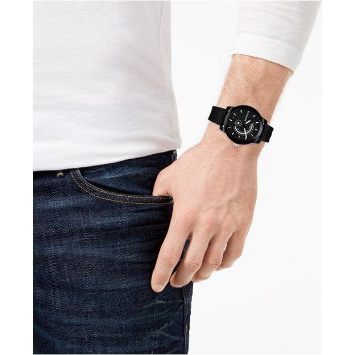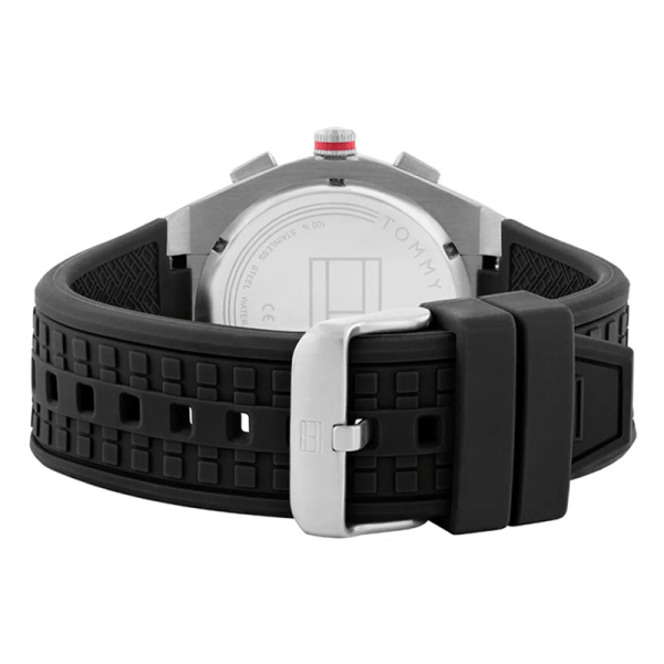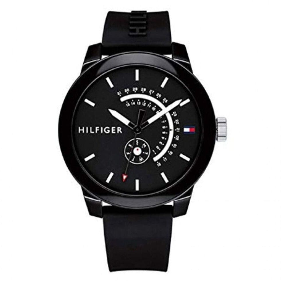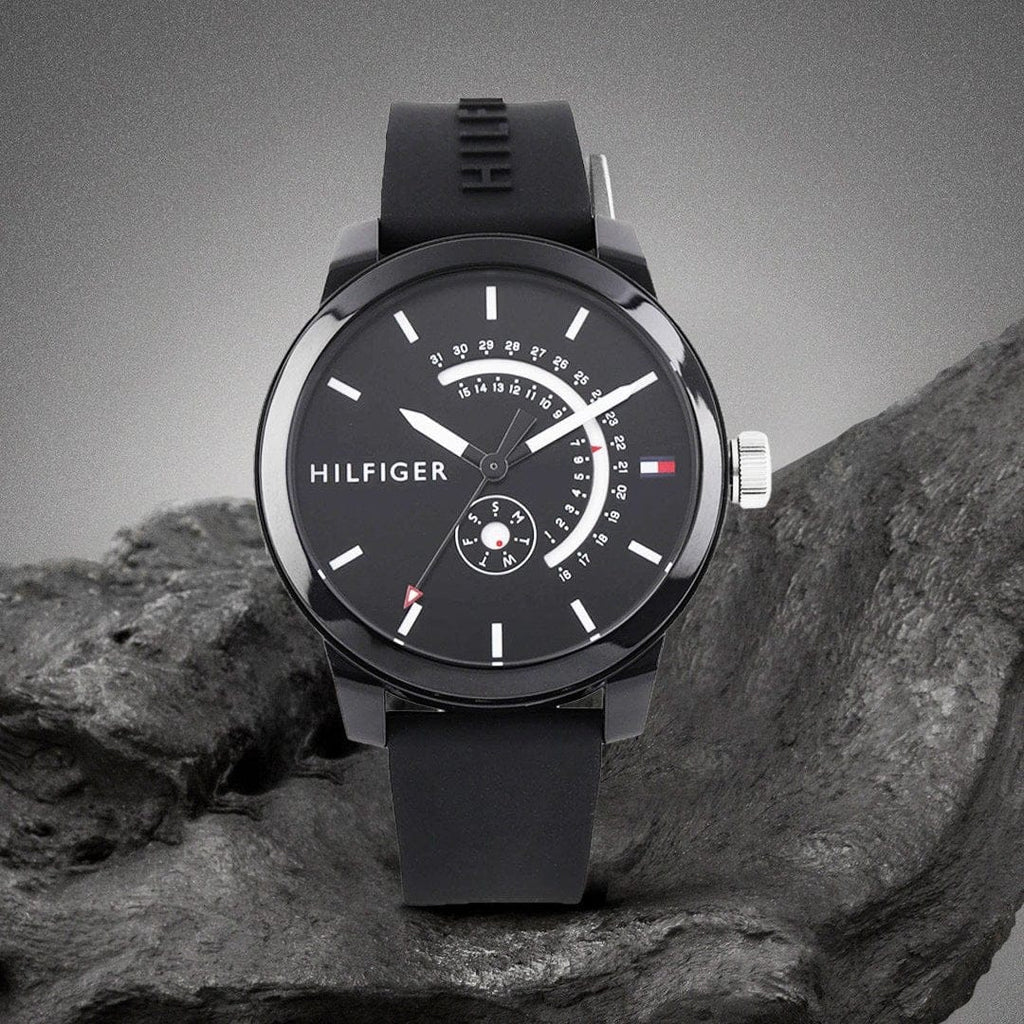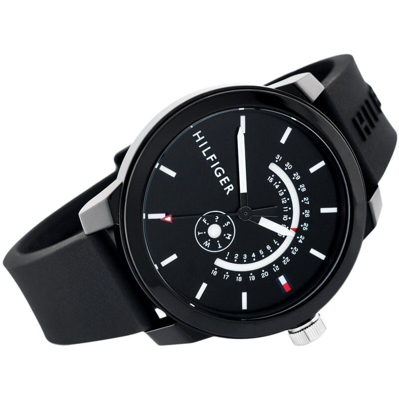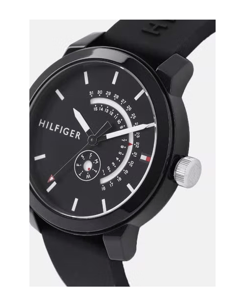 Tommy heritage gets an iconic twist in this sport watch for him. The thermoplastic 44mm case features a Multifunction dial with day and date openings, accented with the Tommy Hilfiger Logo flag at 3 o'clock. The watch comes in a Black Silicone strap with signature debossed Hilfiger Logo. Water resistant to 3 ATM / 30 meters.
