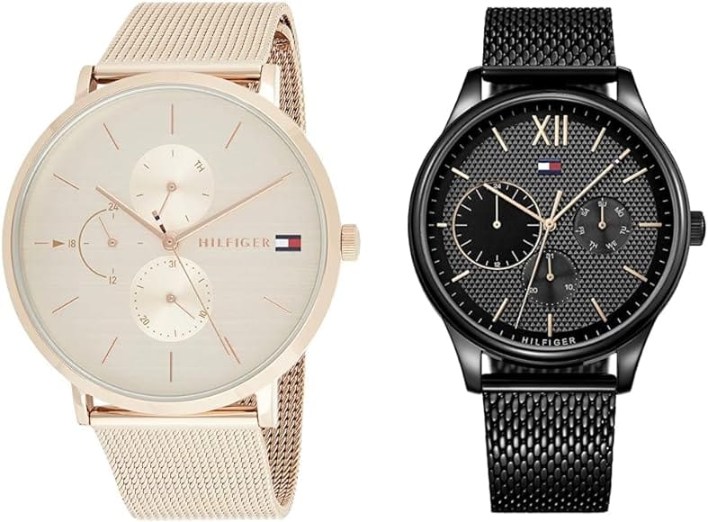 Tommy Hilfiger women's watch. Quartz movement with date functions, day of the week and 24h indicator. Watch with 40 mm case made of rose gold colored steel. Milanese mesh steel bracelet with Deployment Clasp with Push Buttons in rose gold color, 20 mm wide . The dial is pink gold. Water resistance is 3 ATM / 30 meters. Reference: 1781944