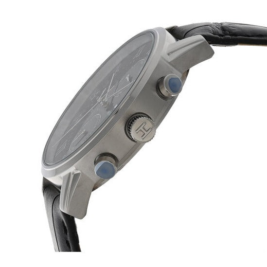 All black and sleek in design is this Tommy Hilfiger Men's Watch. This timepiece features a black leather band, black chronograph face and roman numeral numbering.